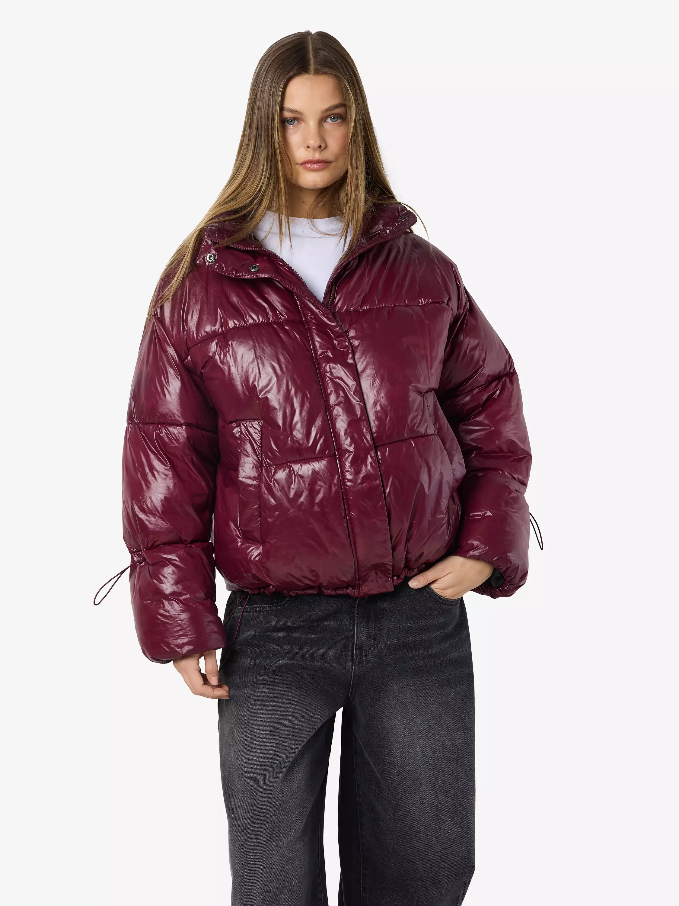 Kiiltäväpintainen puffer-mallinen takki, jossa on edessä vetoketjukiinnitys ja nappilista. Edessä on kaksi avotaskua ja kiristykset löytyy helmasta ja hihoista.