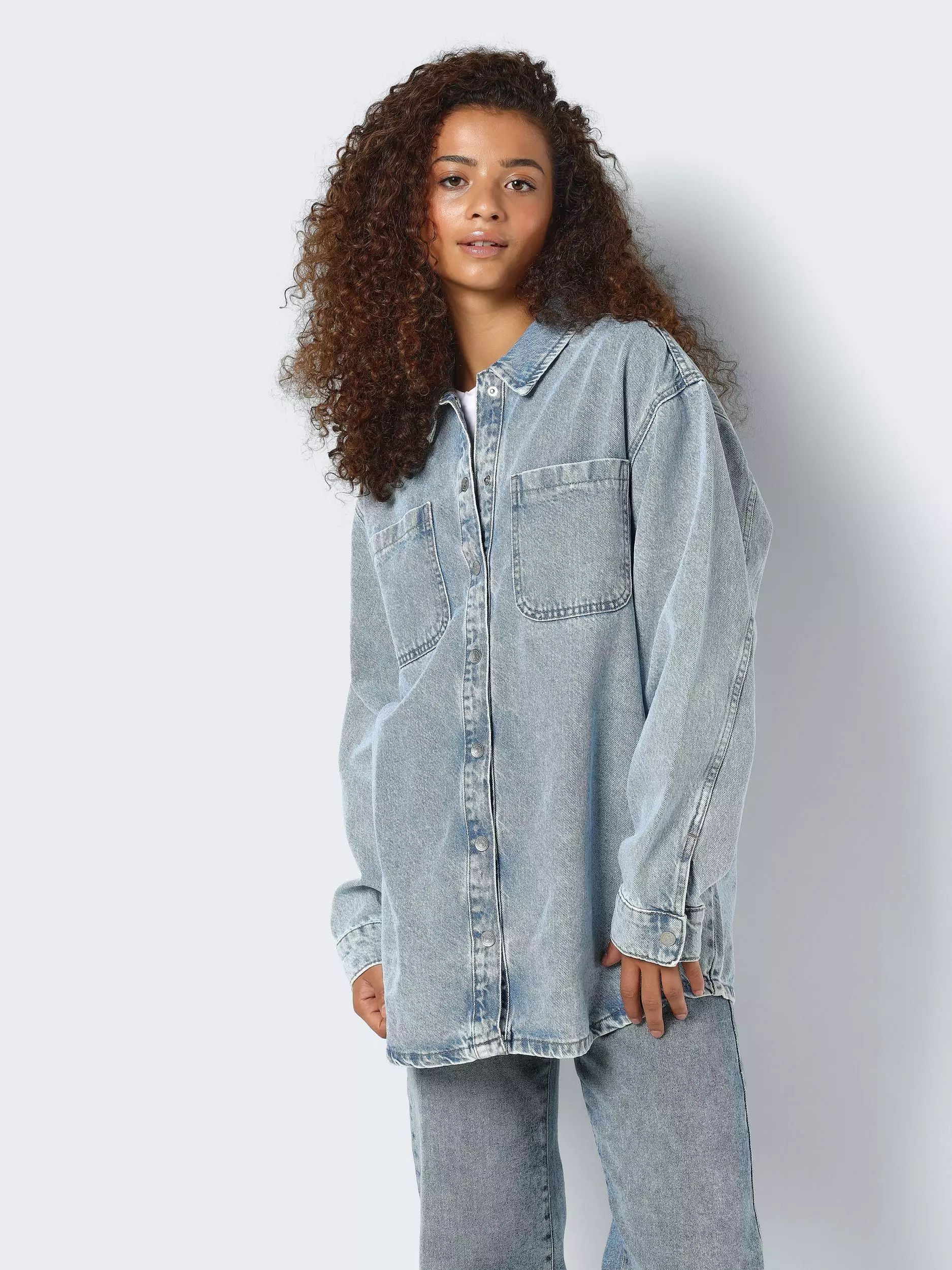 Paitamallinen farkkutakki, jossa on nepparikiinnitys ja kaksi rintataskua. Takissa on reilumitoitus.