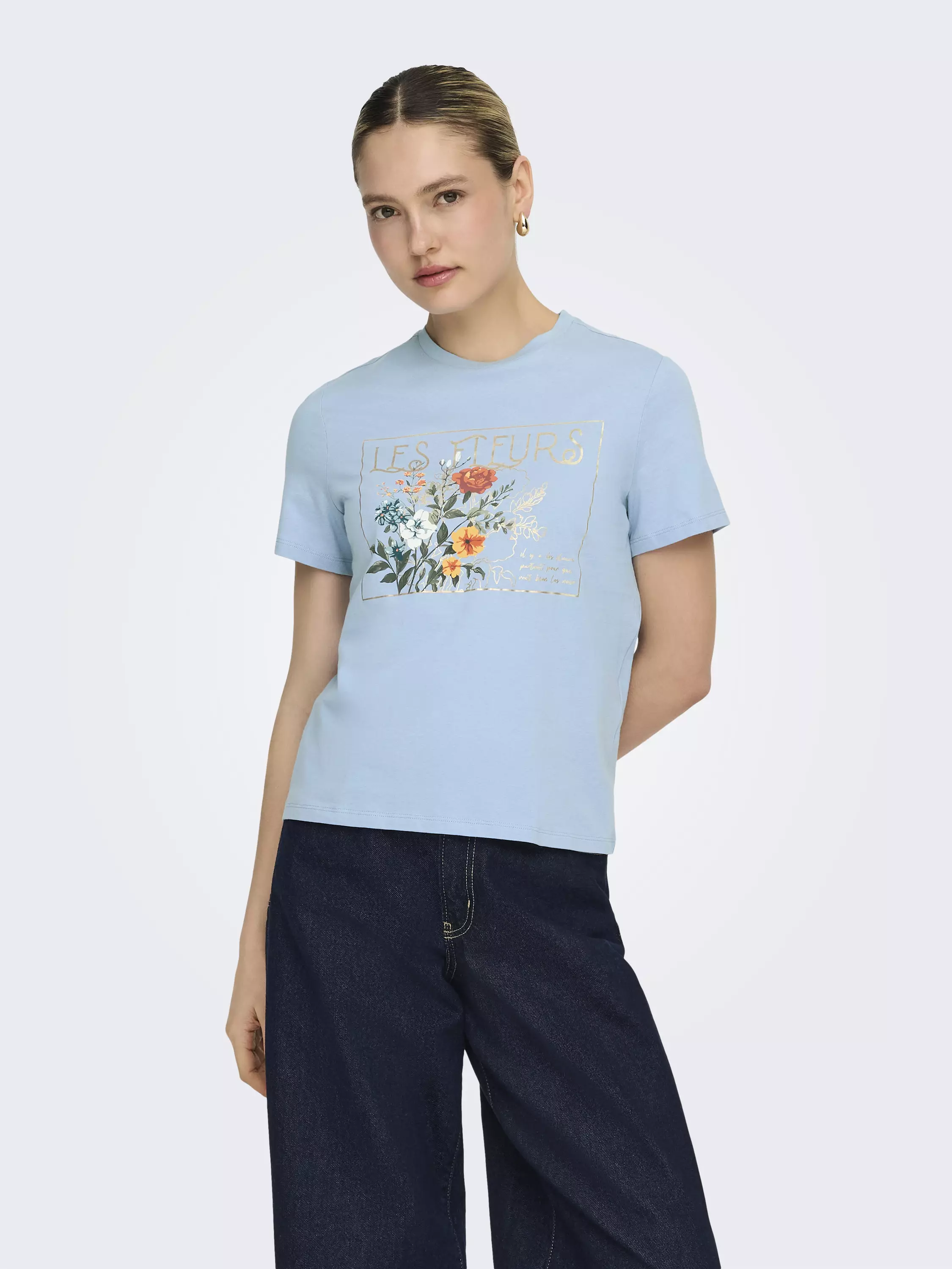T-paita, jossa on edessä kaunis kukkaprintti.