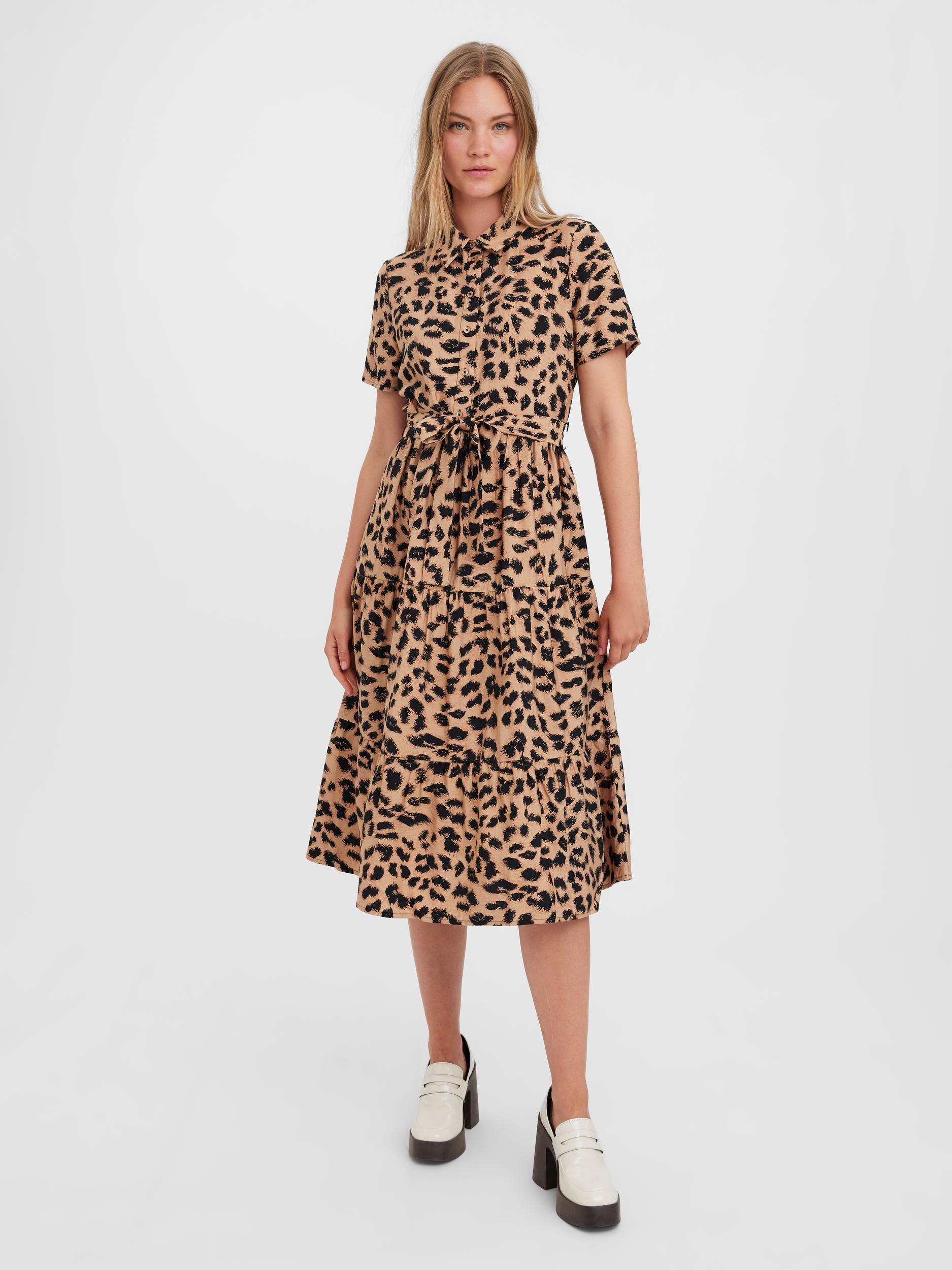 Lyhythihainen mekko, jossa n. polvimittainen salsahelma. Yläosassa nappikiinnitys ja vyötäröllä nauhavyö.
