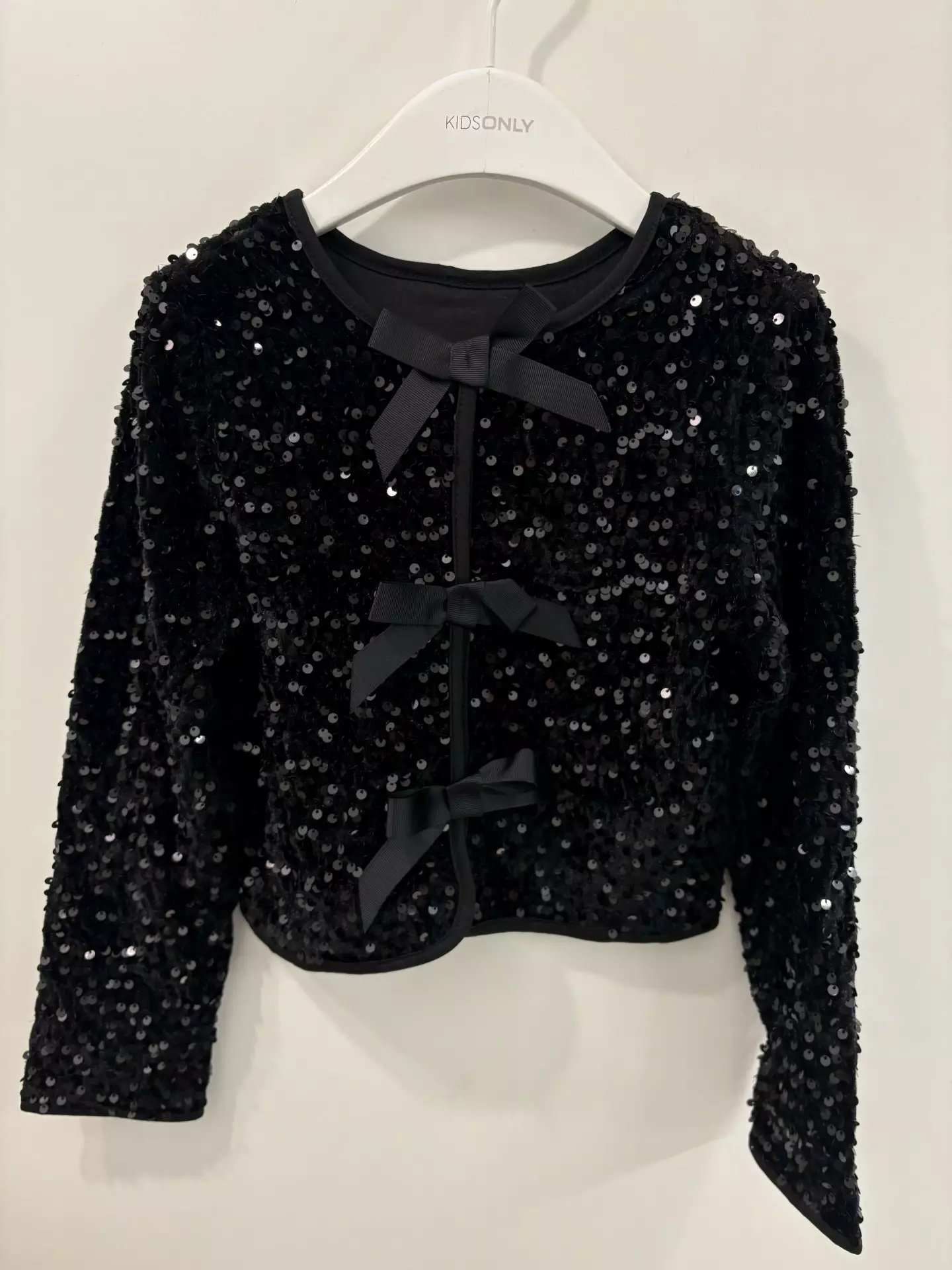 Pitkähihainen paljettijakku, jossa on kauniit rusetit. Jakussa on vuori, jonka ansiosta paljetit eivät rappaa ihoa. voit pitää jakkua molemmin päin. Joko rusetit edessä tai takana.