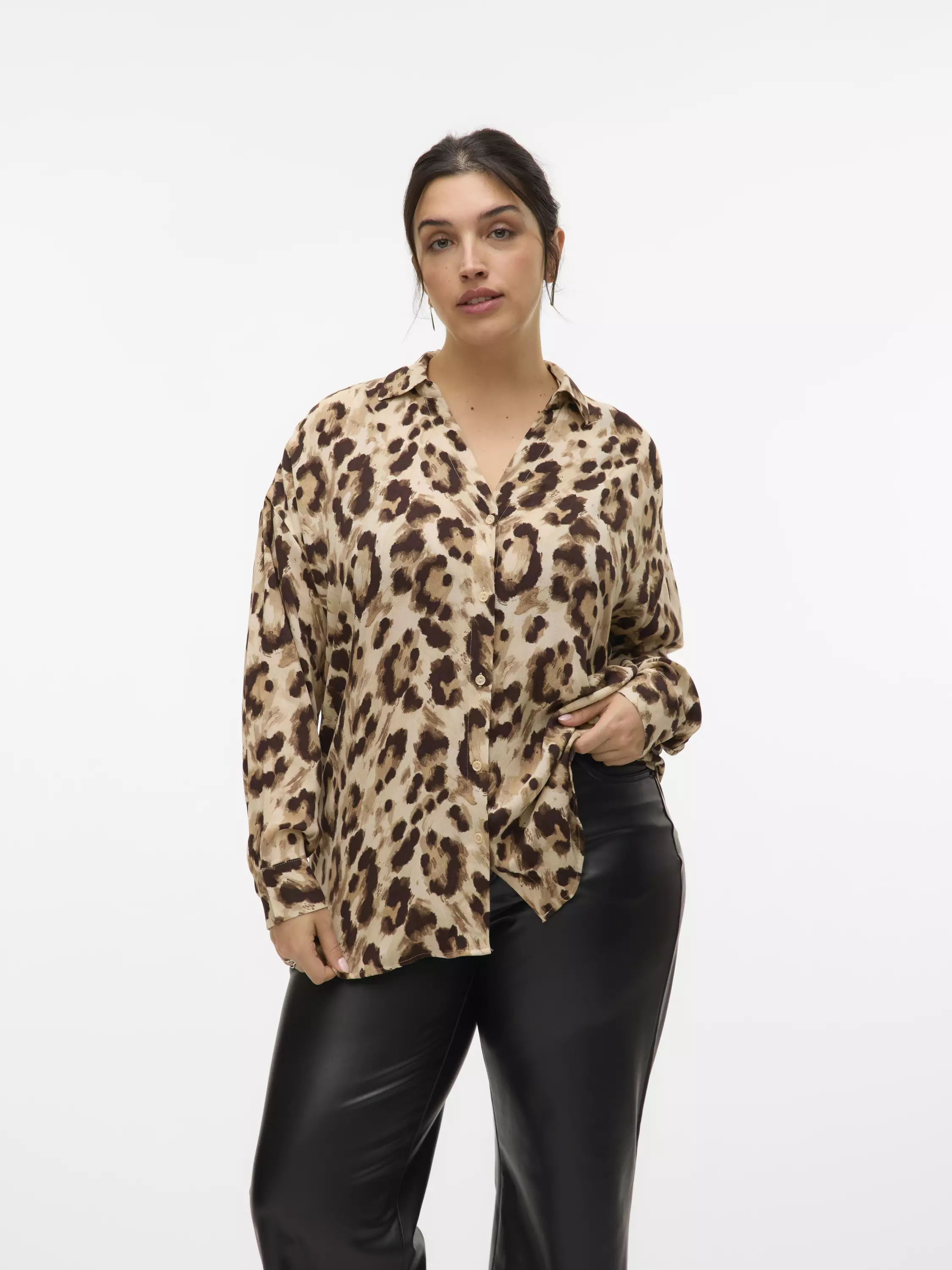 Erittäin laskeutuva kauluspaita, jossa on v-pääntie. Paita on väljää mallia ja takaosa on hieman pidempi kuin etuosa. Paidassa on nappikiinnitys alas saakka.