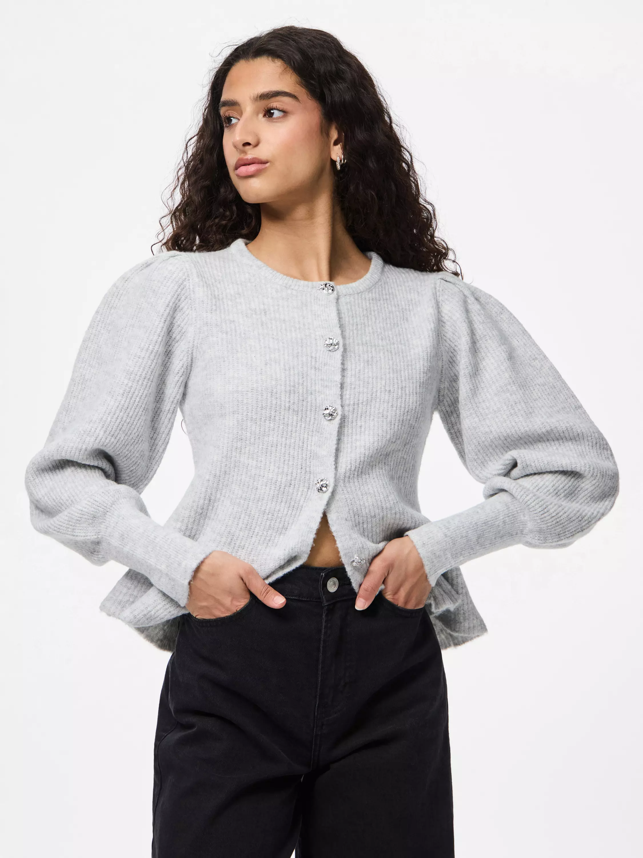 Istuva neuletakki, jossa on puffihihat ja edessä on napit.