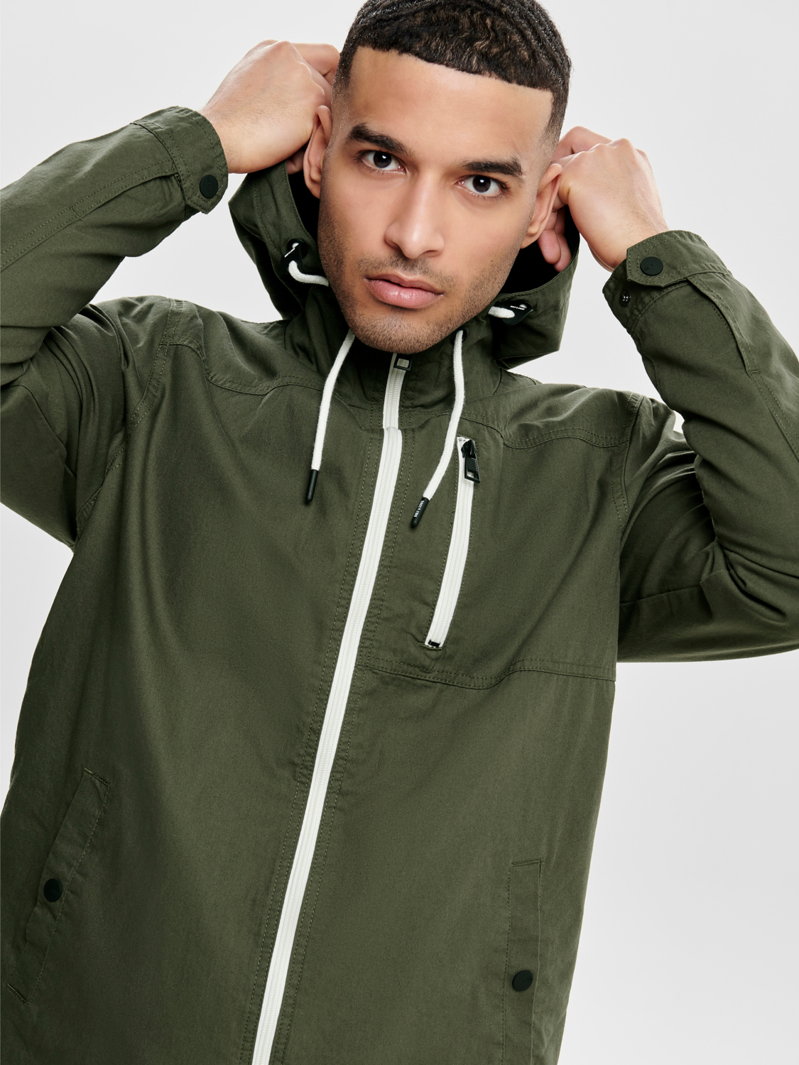 Vuoritettu ohut takki, edessä kaksi nepparitakua ja vetoketjutasku. Helma on takaa vähän pidempi.