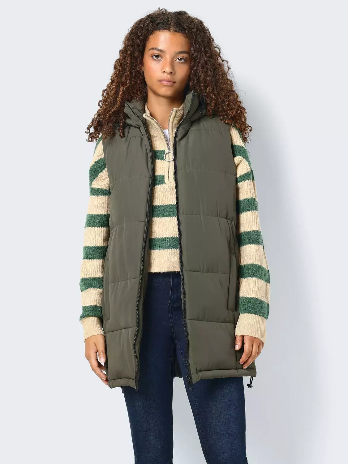 Polvimittainen hupullinen toppaliivi, jossa on edessä vetoketjukiinnitys sekä taskut. Hupussa, helmassa ja selkäpuolella on kiristysnaru.
