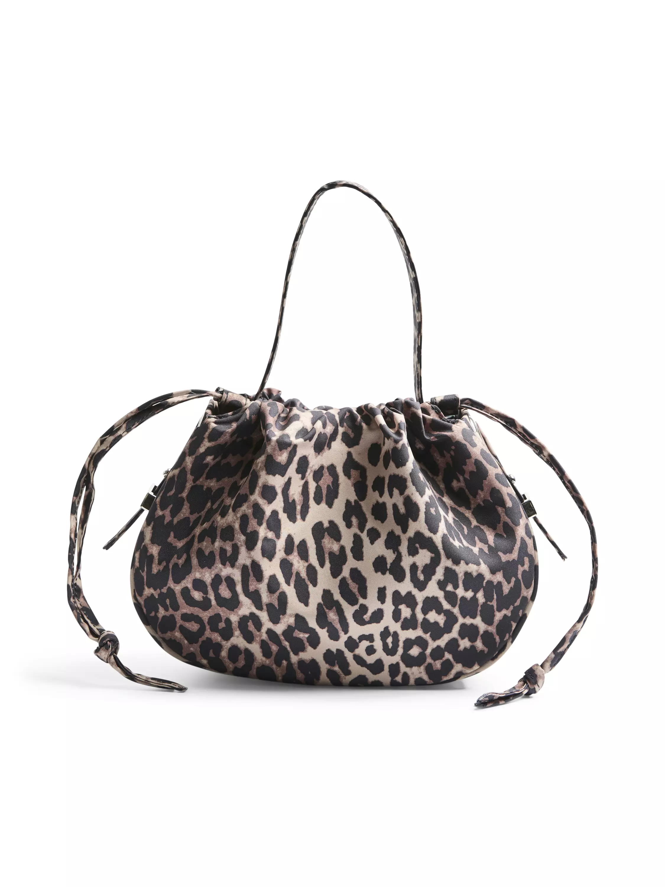 Söpö laukku, jossa on kahva ja laukun saa suljettua nyöreillä. Lakussa on myös mukana pidempi hihna. Laukun leveys on 24 cm ja korkeus on 18 cm.