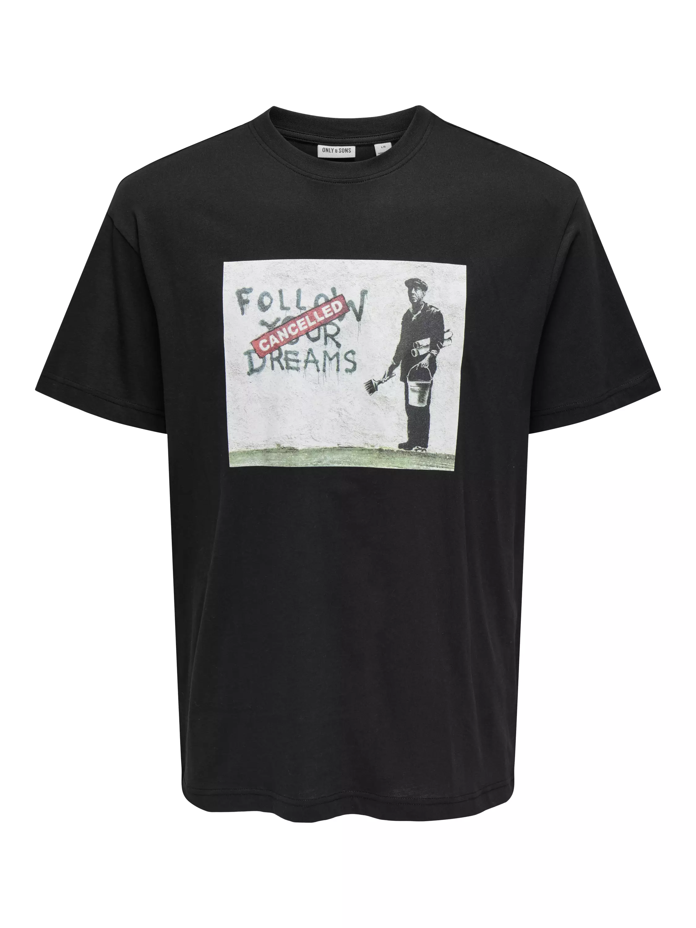 Relaxed-mallinen t-paita, johon on painatettu katutaiteilija Banksyn teos eteen.