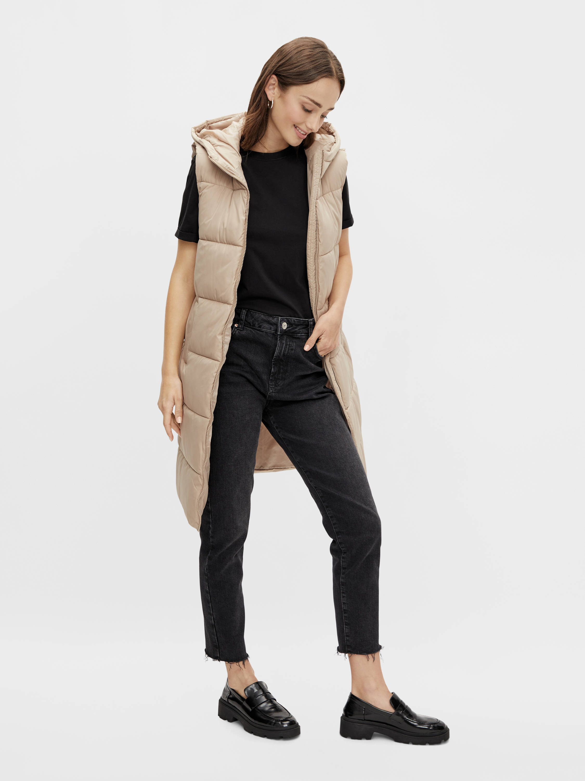 Polvimittainen ja hupullinen toppaliivi, edessä taskut. Vetoketju aukeaa myös alhaalta.