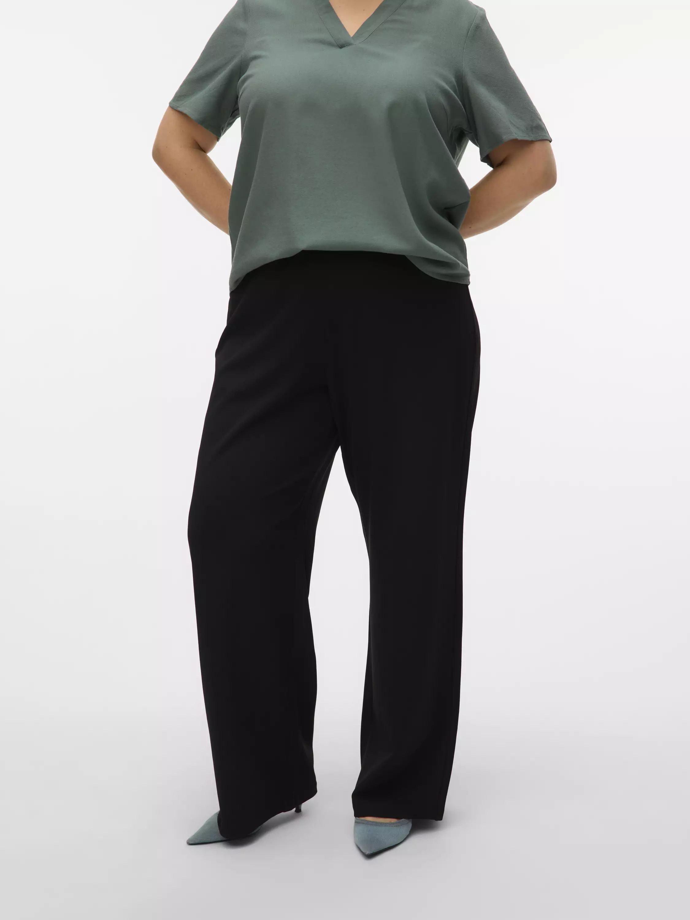 Korkeavyötäröiset leveät housut, joissa on joustava materiaali. Vyötäröllä on joustava kuminauha.