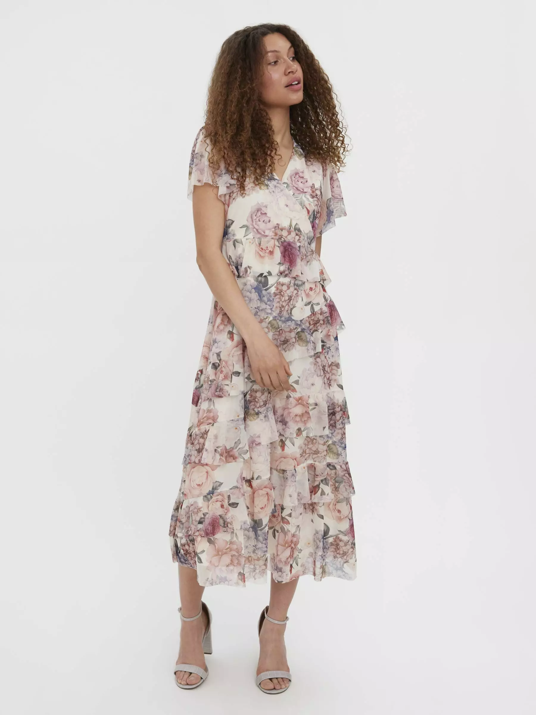 Vuoritettu pitkä mekko, jossa v-pääntie ja perhoshihat. Helmassa on kauniit röyhelösomisteet.