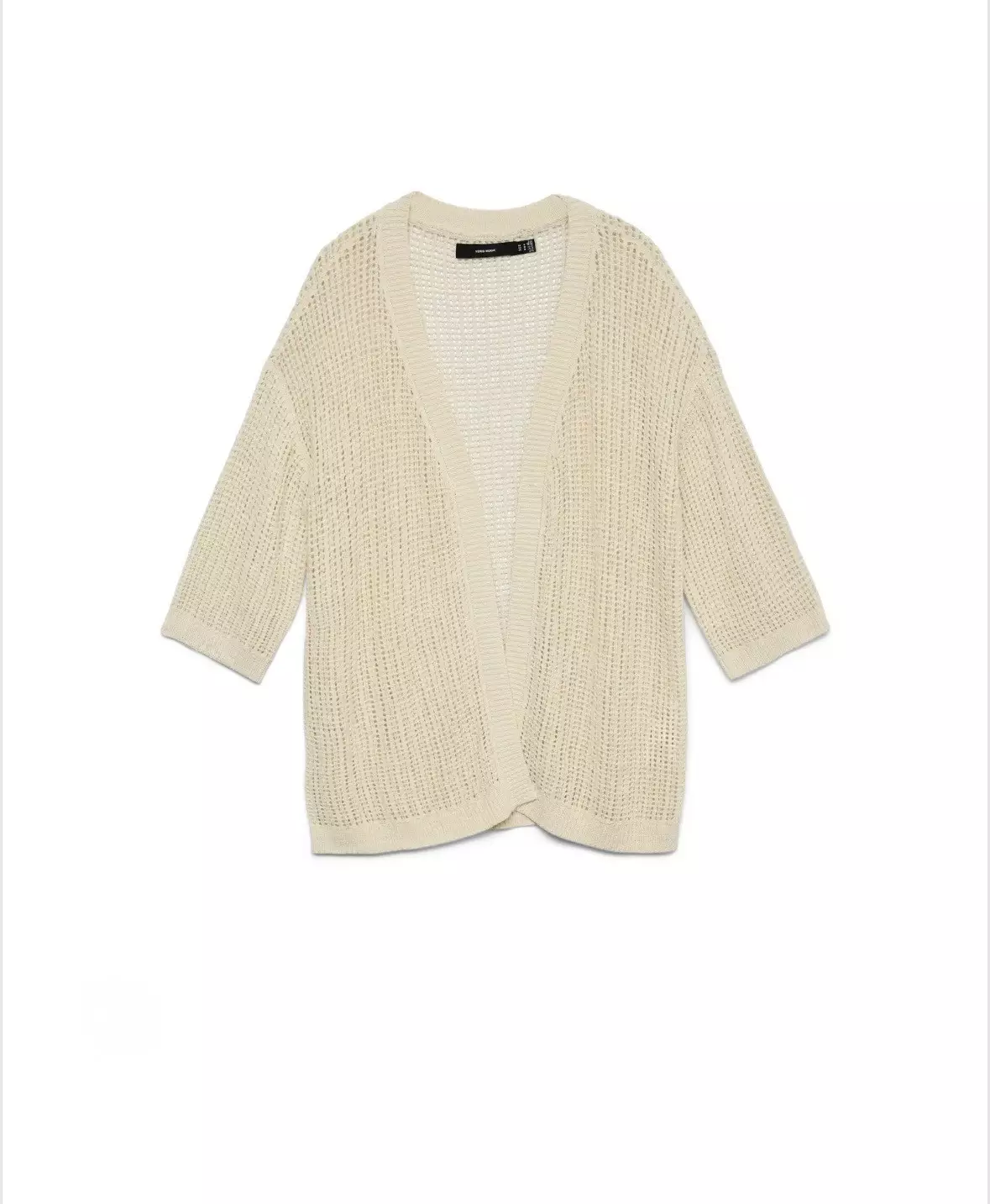 Avoin neuletakki, jossa on 3/4-hihat. Neuleen mitta on peffan alapuolelle.