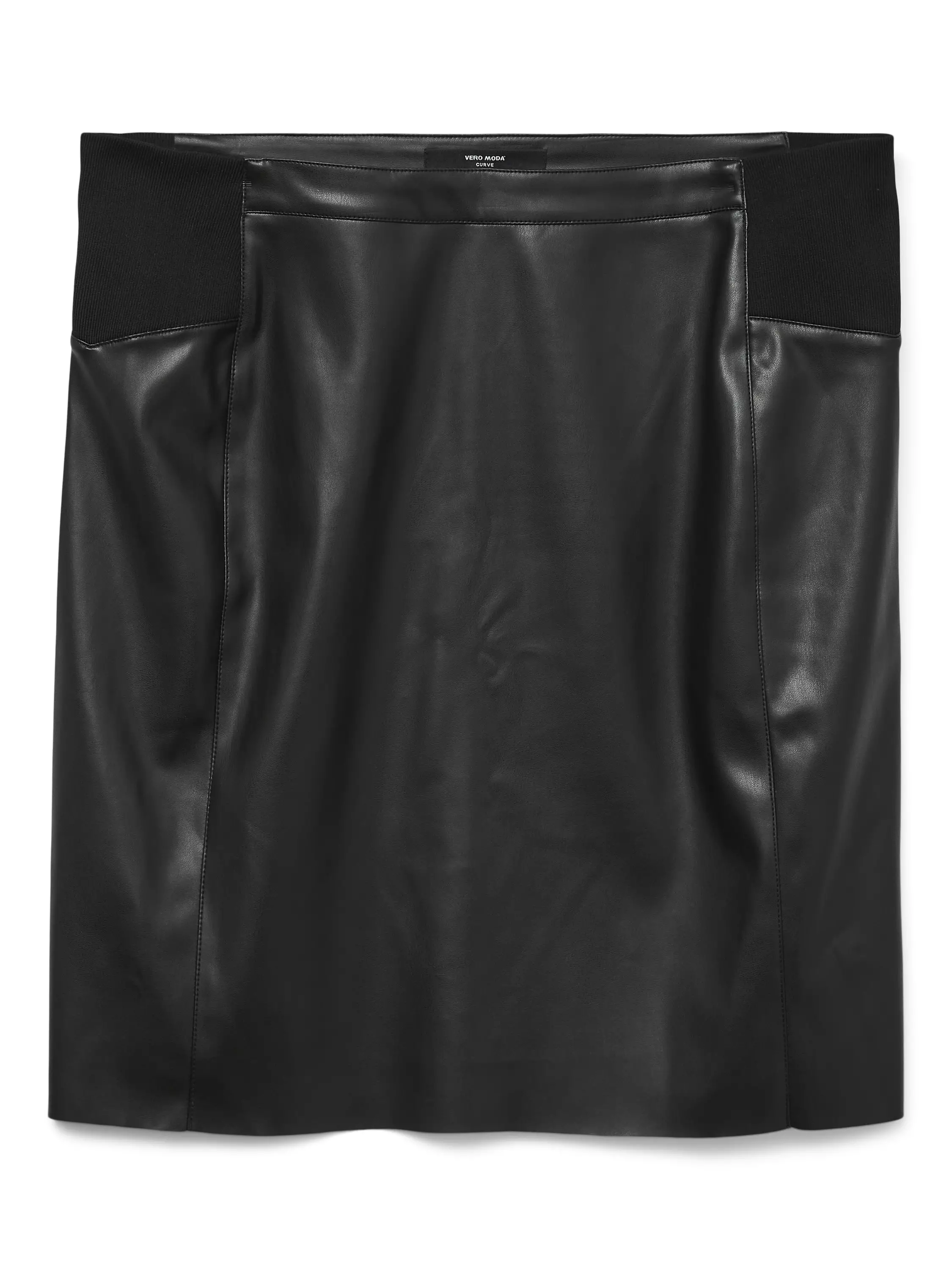 Polvimittainen keinonahkahame, jossa on korkea vyötärö. Vyötärön sivuilla on joustavaa resorineuolosta.