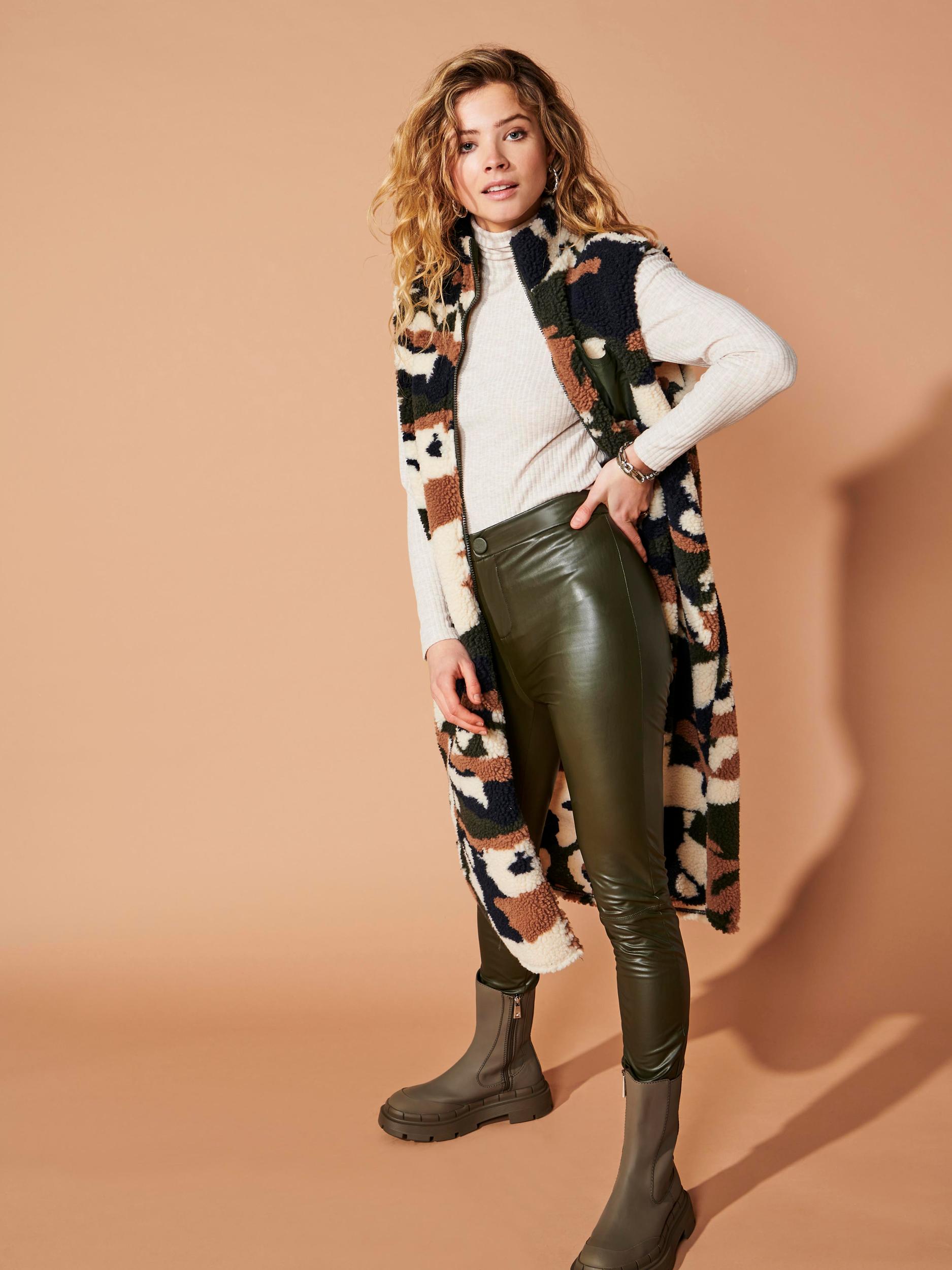 Pitkä vetoketjullinen teddyliivi, jossa helman sivuilla halkiot ja edessä pieni tasku.