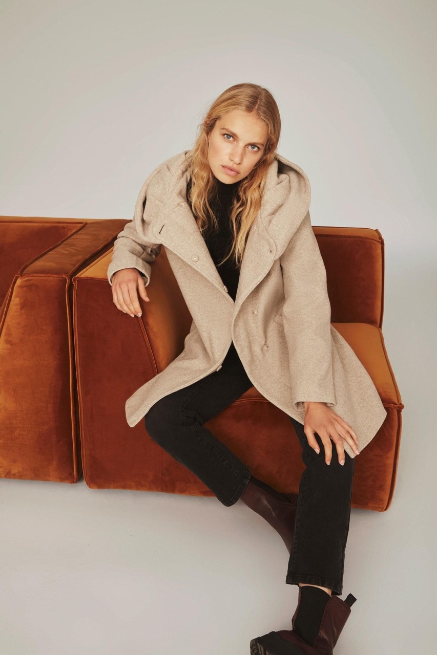 HIeman A-linjainen villakangastakki, jossa on ohut vuori. Nepparikiinnitys ja kaunis huppu, joka suojaa hyvin edestä.