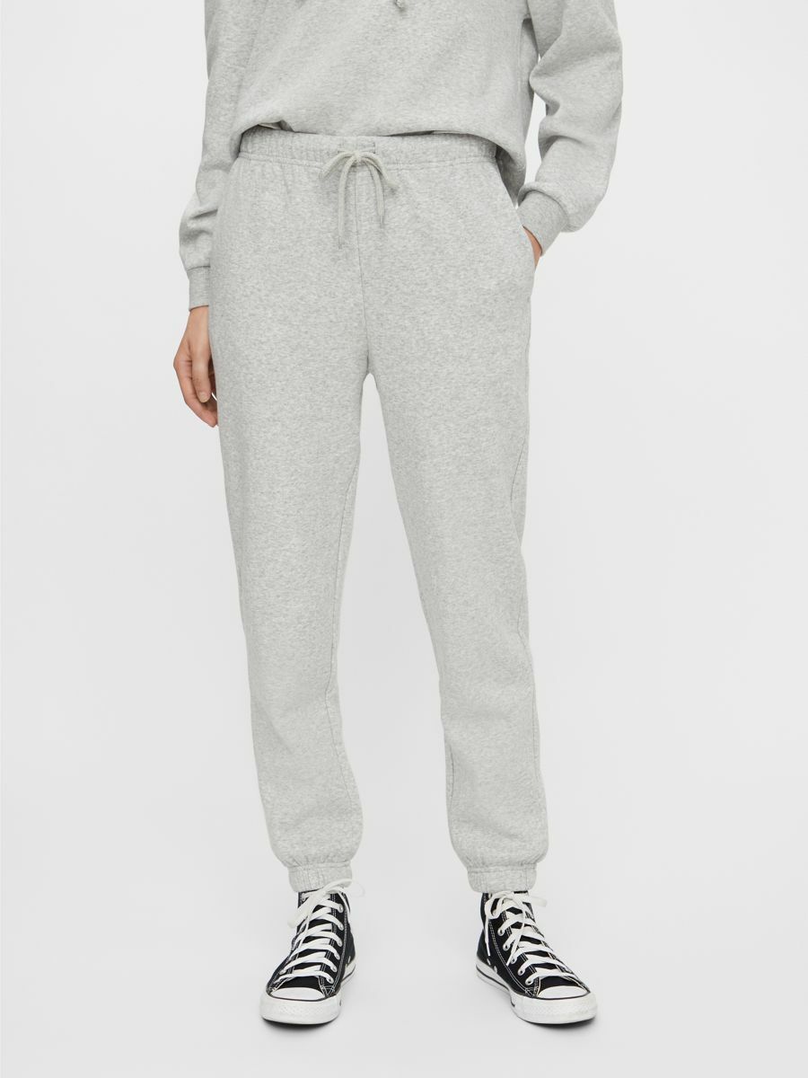 Korkeavyötäröiset collegehousut, joissa on kapeat lahkeet ja kiristys vyötäröllä.