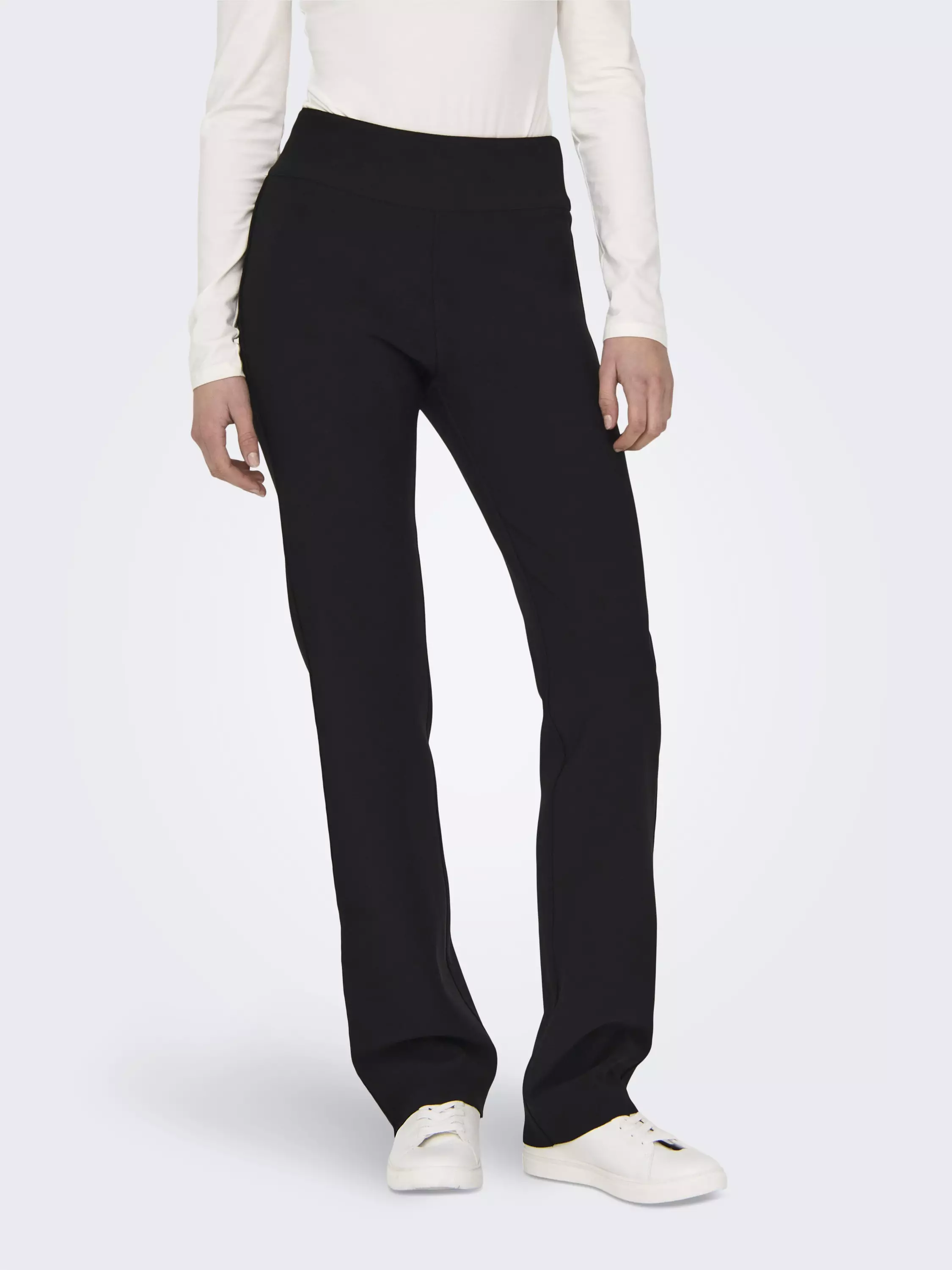 Mustat suorat korkeavyötäröiset ja erittäin joustavat housut. Lahkeet pystyy lyhentämään leikkaamalla. Housuissa on leveä vyötärökaistale.