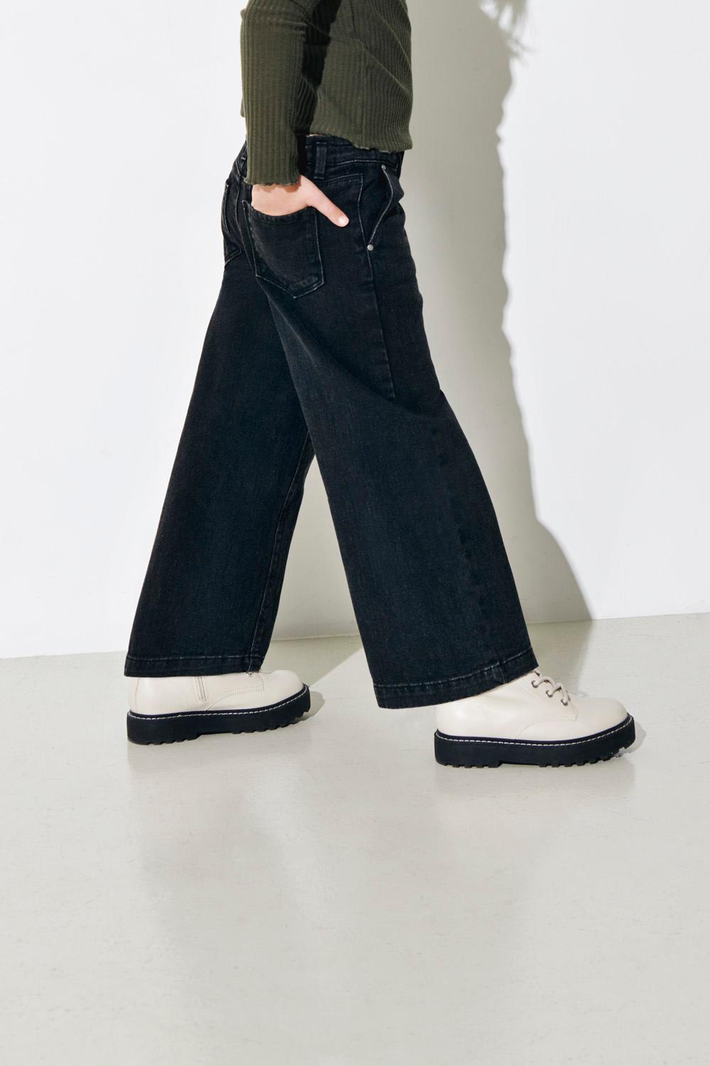 Normaalivyötäröiset leveät farkut. Farkuissa on pehmeä materiaali. Vyötärön sisäpuolella kuminauhakiristys.