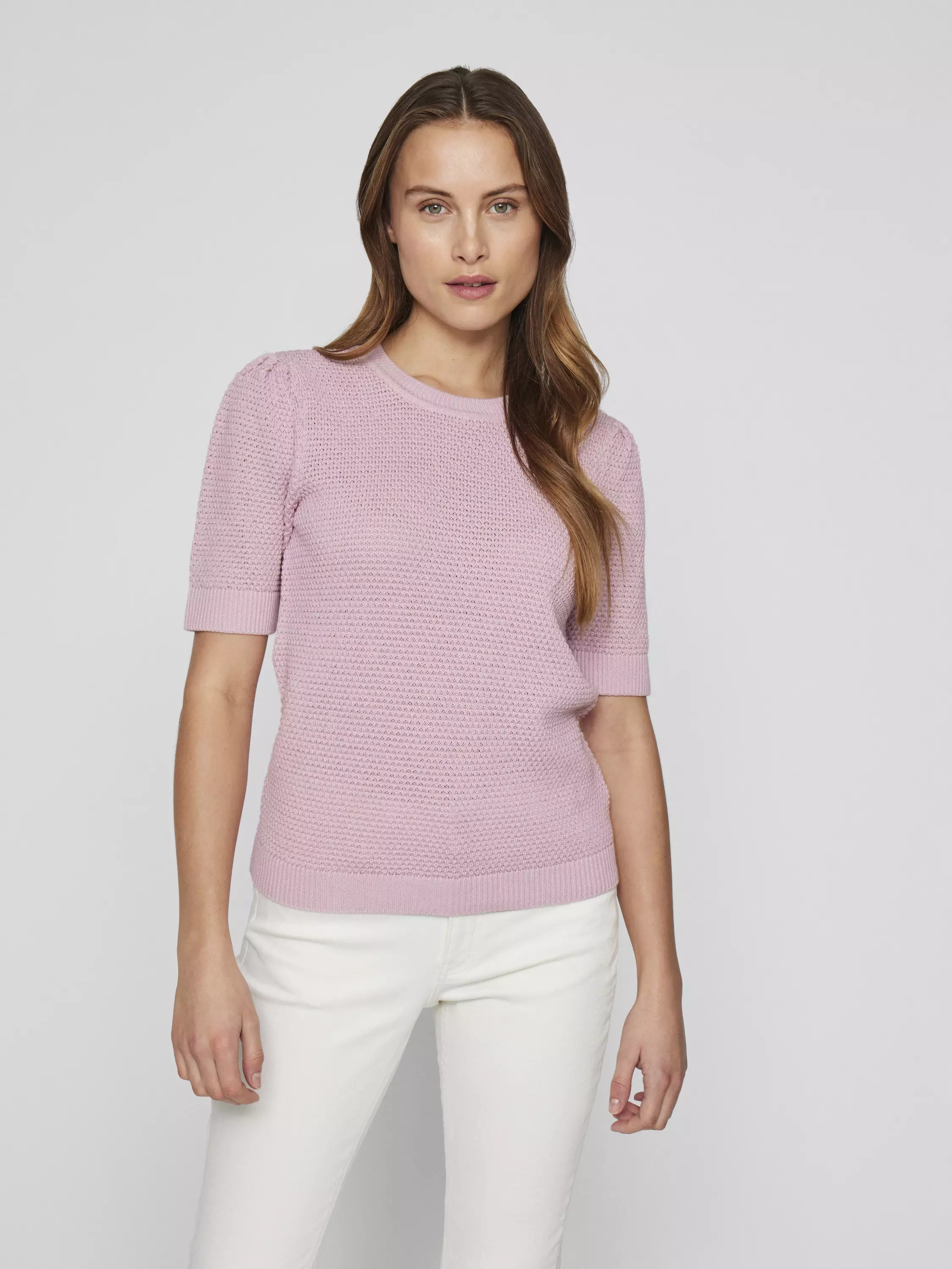 Puuvillaneule, jossa on lyhyet puffihihat. Neuleessa on kaunis struktuuripinta ja pyöreä pääntie.