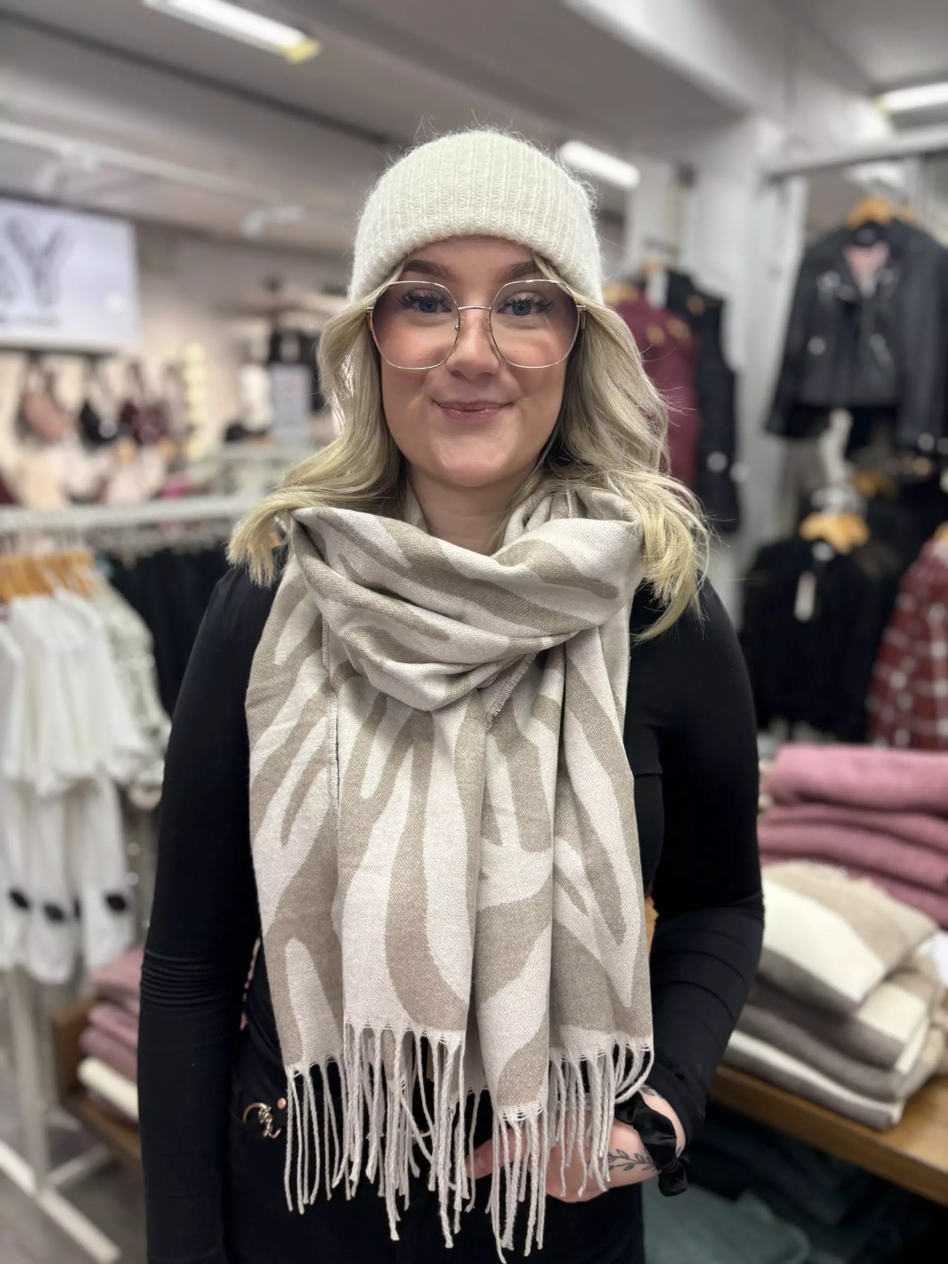 50 cm leveä ja 200 cm pitkä pehmoinen huivi. Huivin päissä on hapsut.