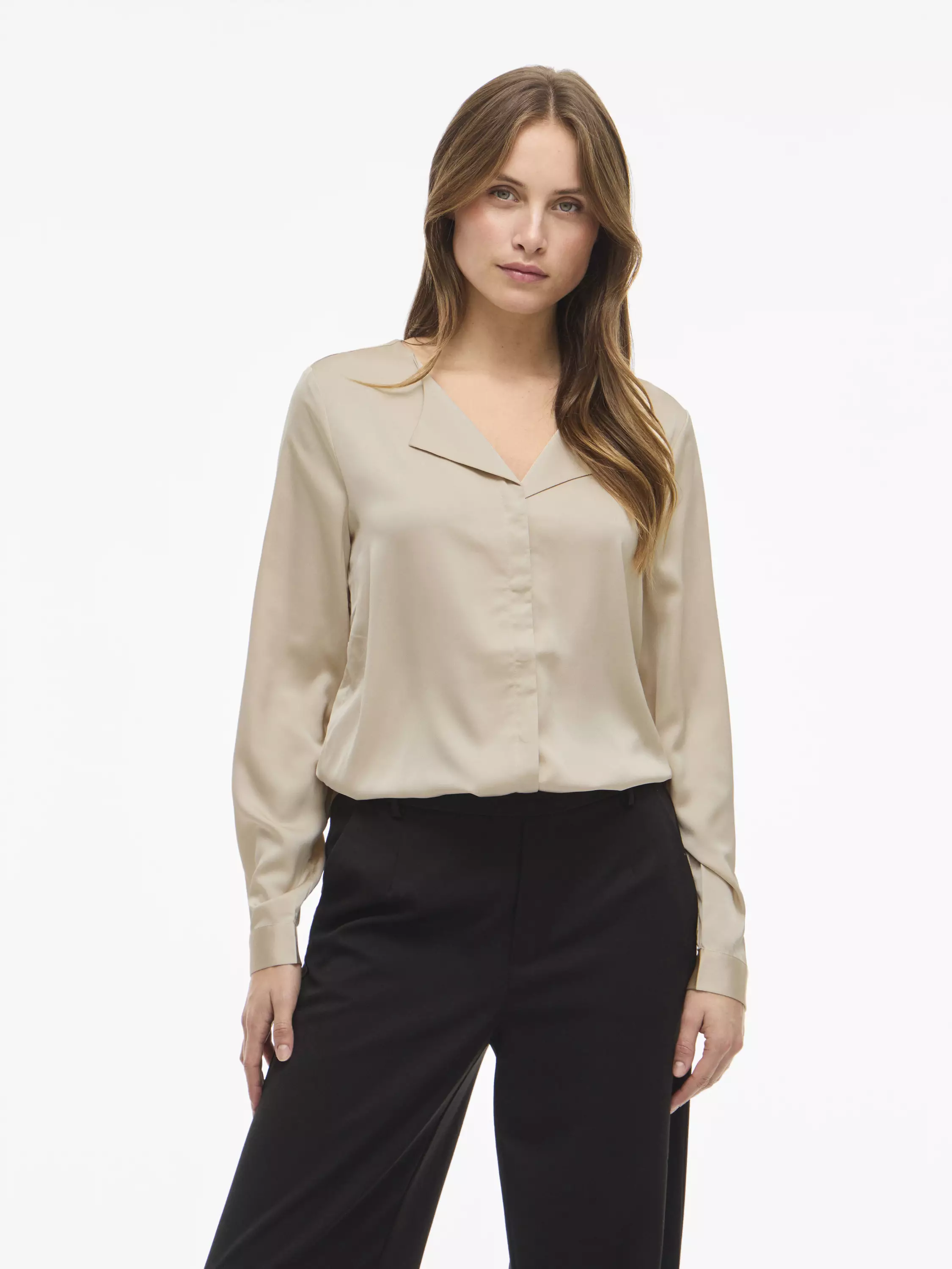 Kaunis pitkähihainen satiinipaita, jossa on kaulukset ja napit nappilistan alla. Paidan helma on takaa hieman pidempi.