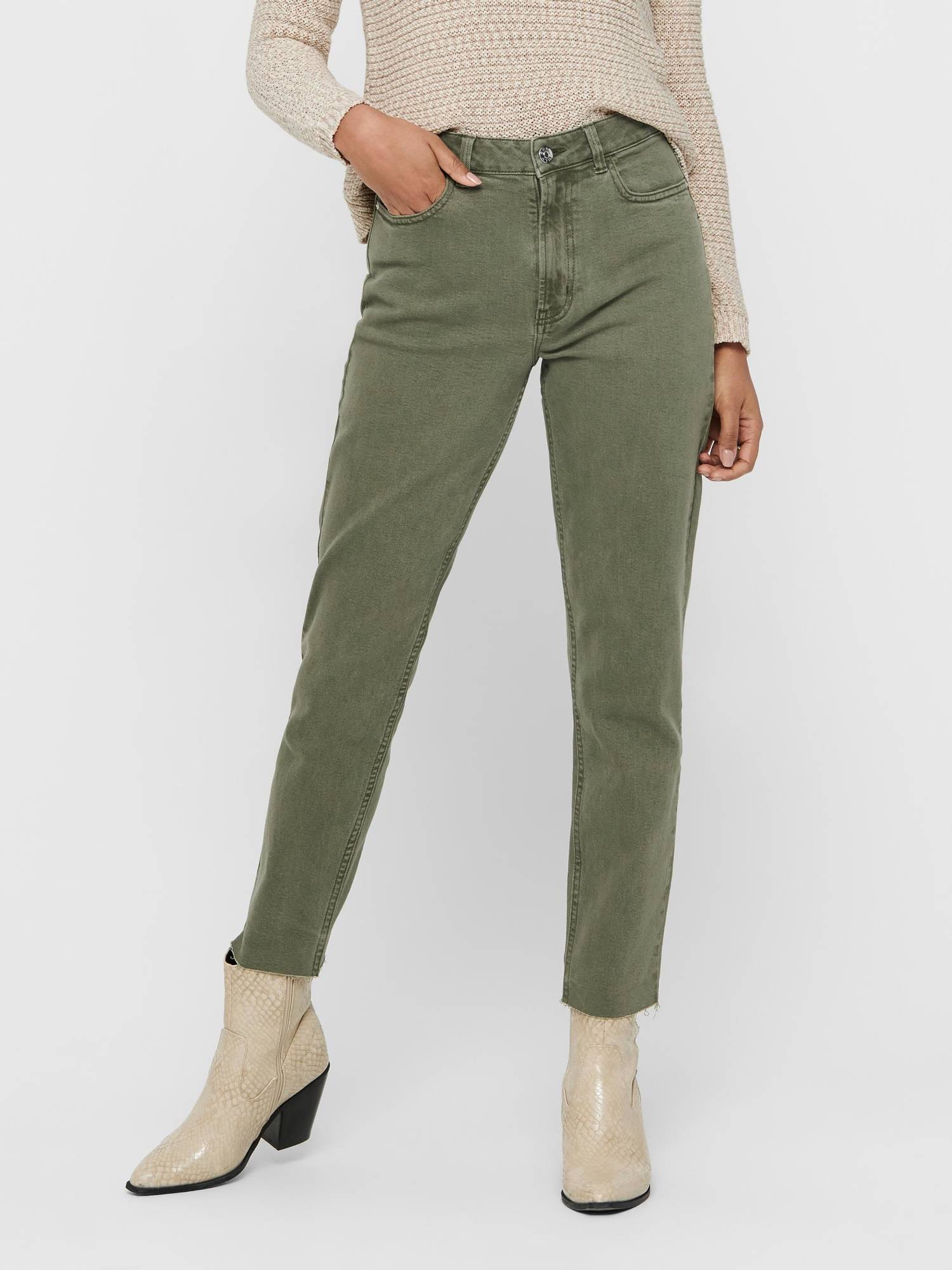 Suoran malliset ja korkea vyötäröiset vihreät farkut, nilkkamittaiset lahkeet.