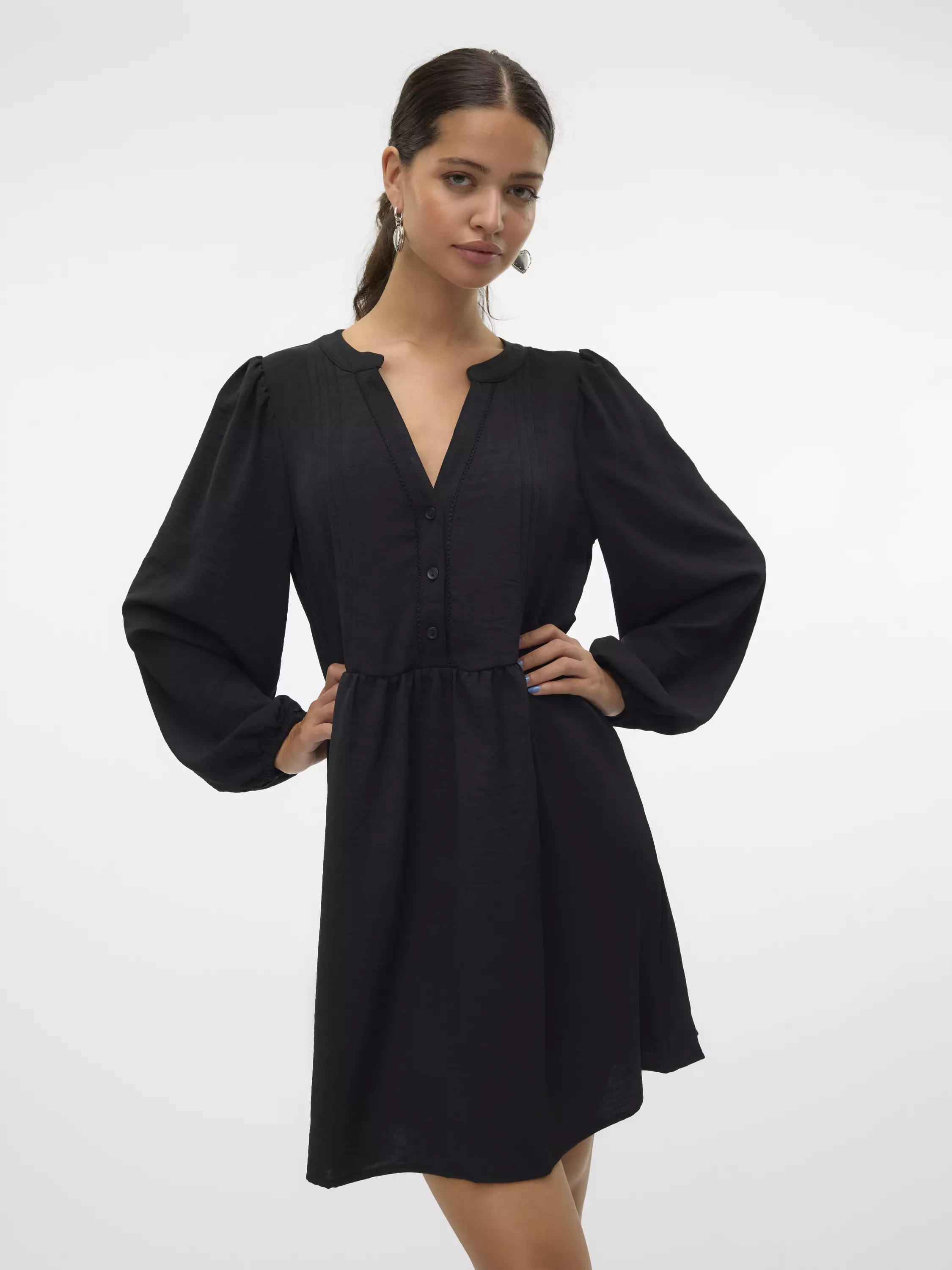 Pitkähihainen polvimittainen mekko, jossa on yläosassa edessä napit. Mekossa on v-pääntie ja mukava joustava materiaali. Hihansuissa on joustavat kuminauhat.