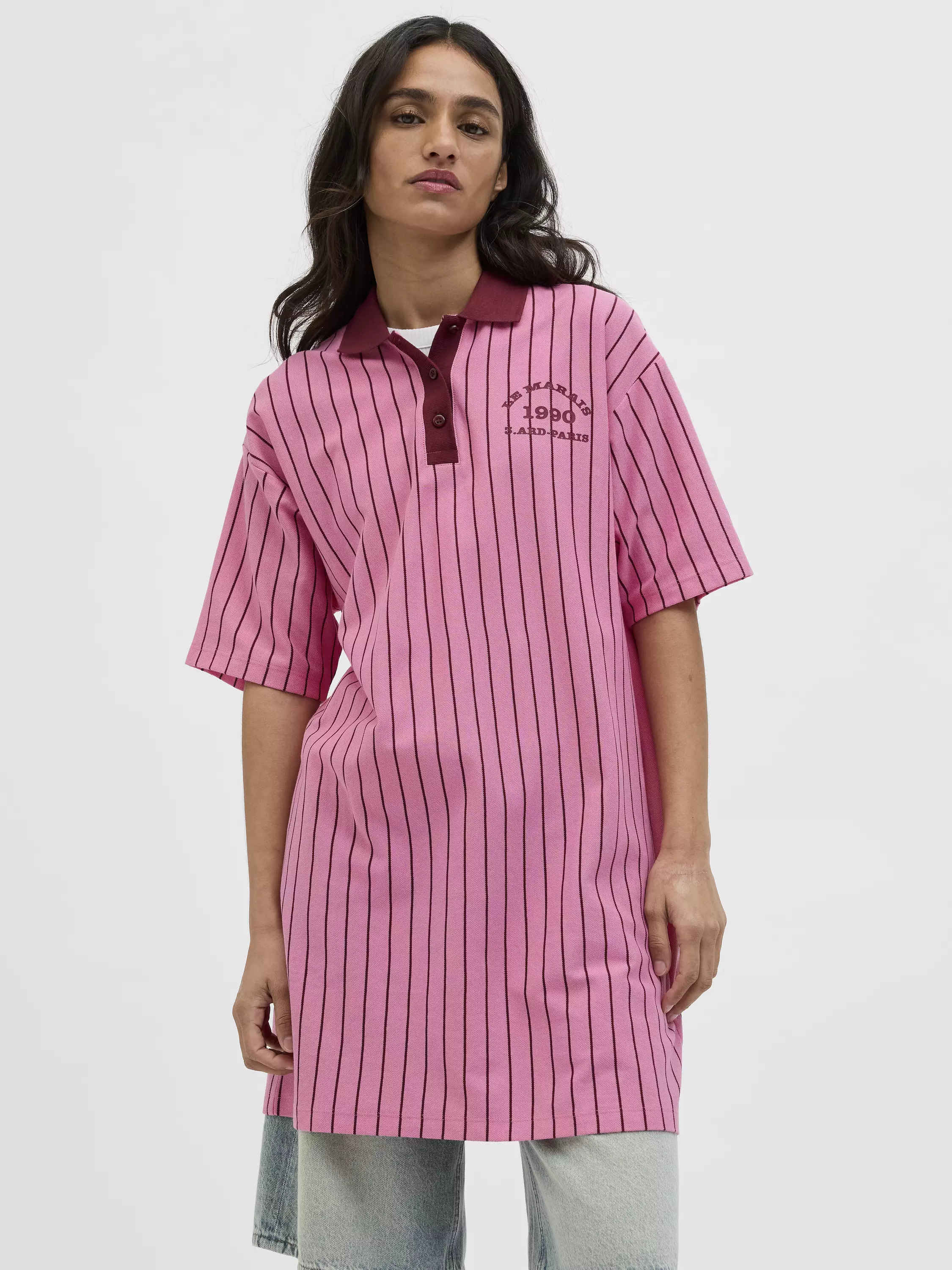 Reisimittainen pikeemekko, jossa on kaulukset sekä napit.