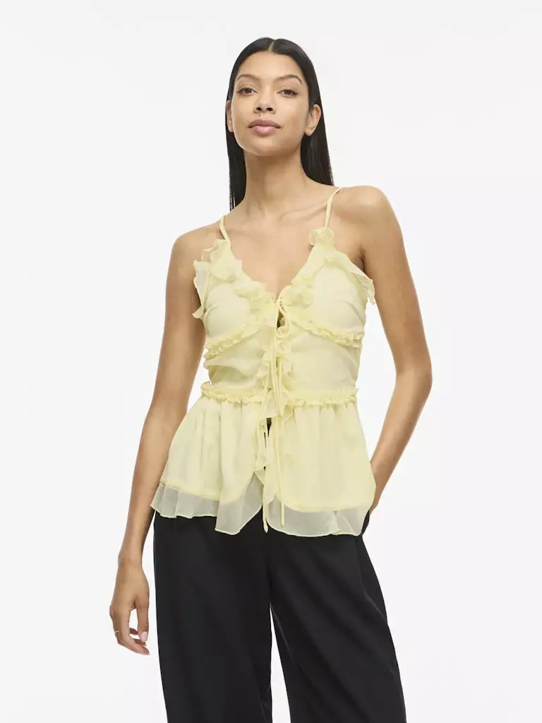 Kaunis vuorillinen röyhelötoppi, jossa on säädettävät olkaimet ja edessä on solmittavat rusetit.