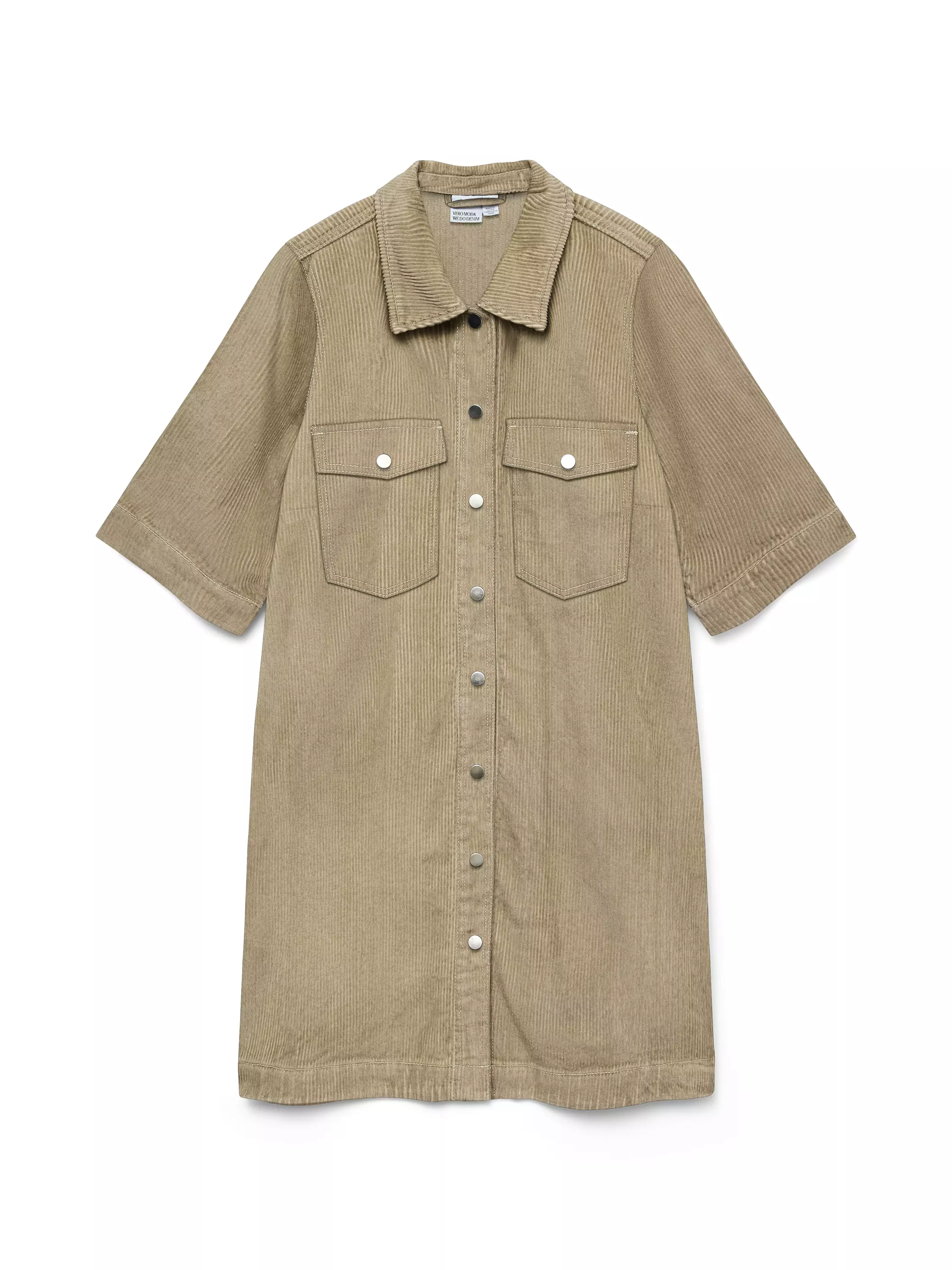 Polvimittainen samettimekko, jossa on 1/2 -hihat ja edessä kaksi rintataskua. Mekossa on nepparikiinnitys.