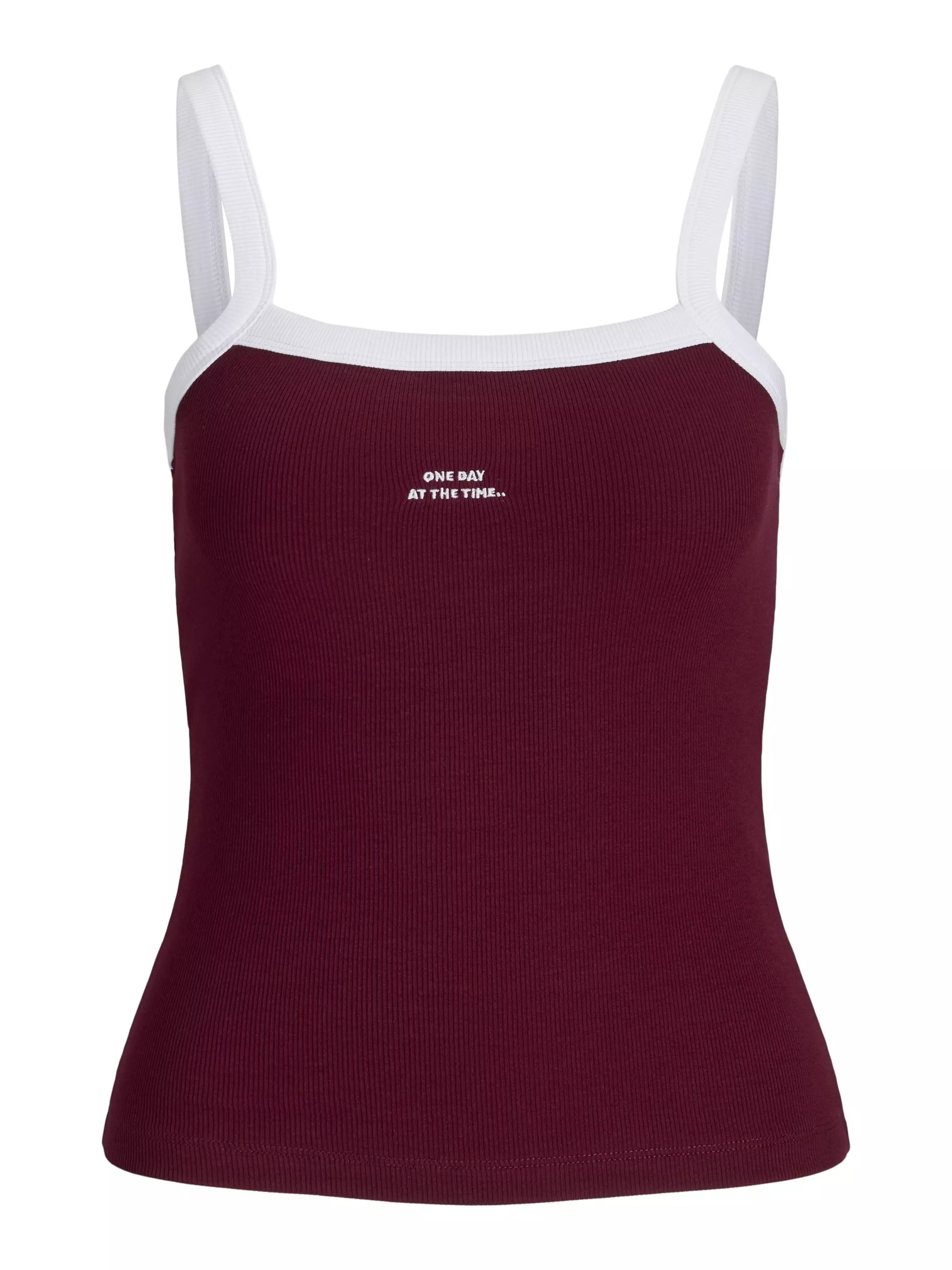 Toppi, jossa on edessä brodeerattu teksti. Topin kangas on joustavaa ribbikangasta.