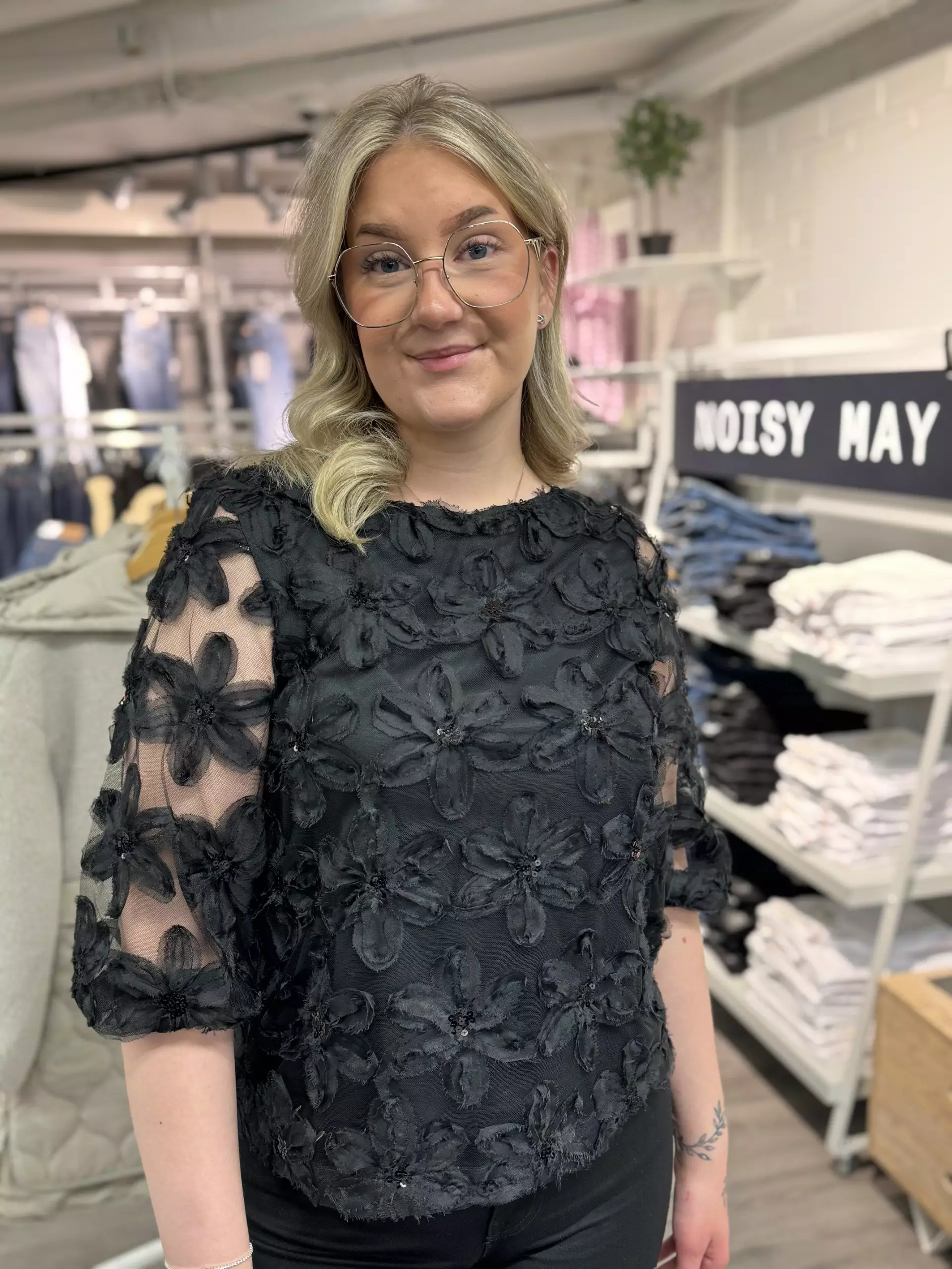 Kaunis 3/4-hihainen paita, jossa on kankaisia kukkasia ommeltu tyllikankaaseen. Paidassa on läpikuultavat hihat ja vartalo-osa on vuoritettu. Paljetit tekevät paidasta juhlavan.