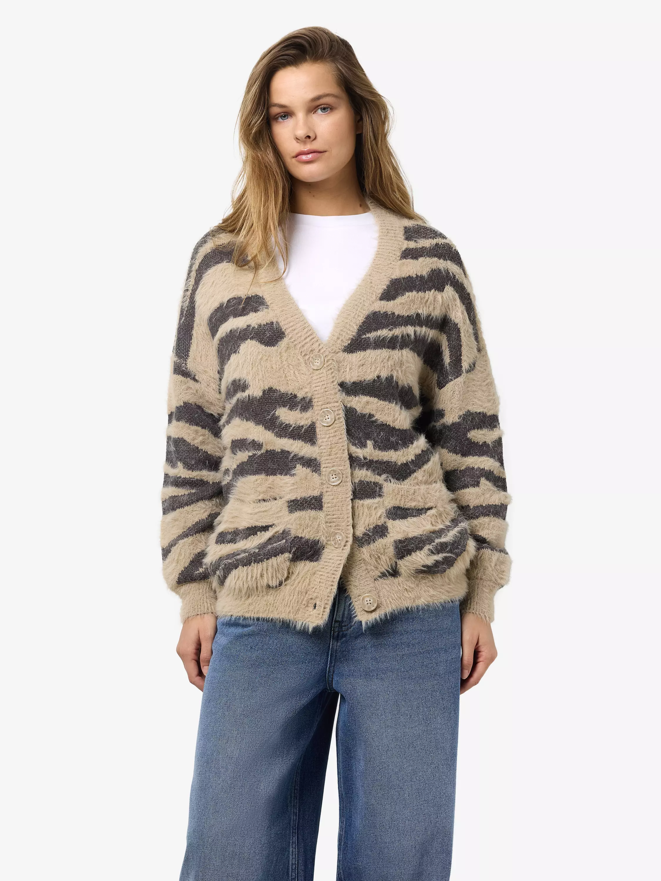 Pörröinen ja pehmoinen neuletakki, jossa on v-pääntie ja edessä napit.