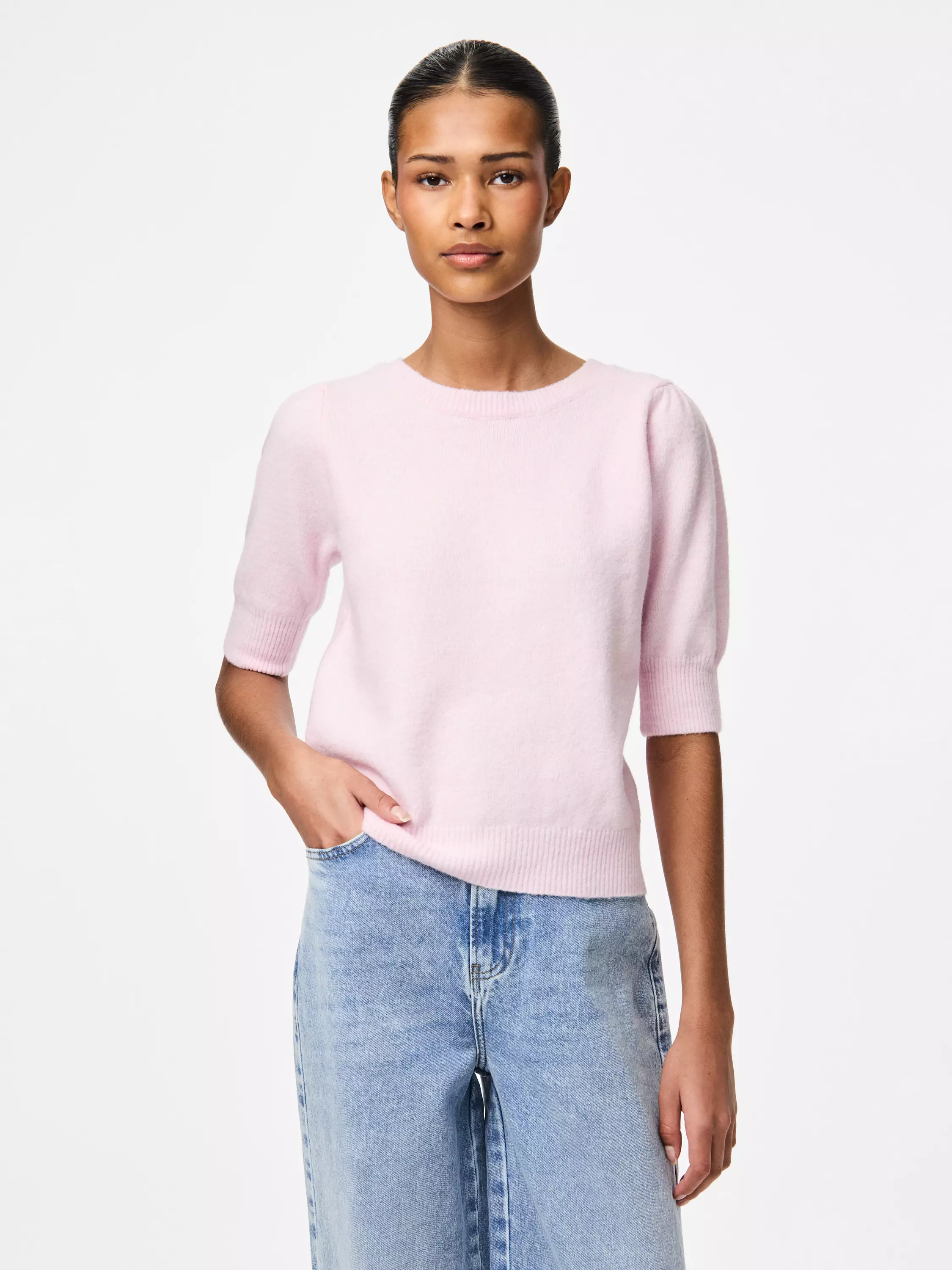 Lyhythihainen neulepaita, jossa on selkäpuolella kaunis rusetti. Neuleessa on kauniit puffihihat.