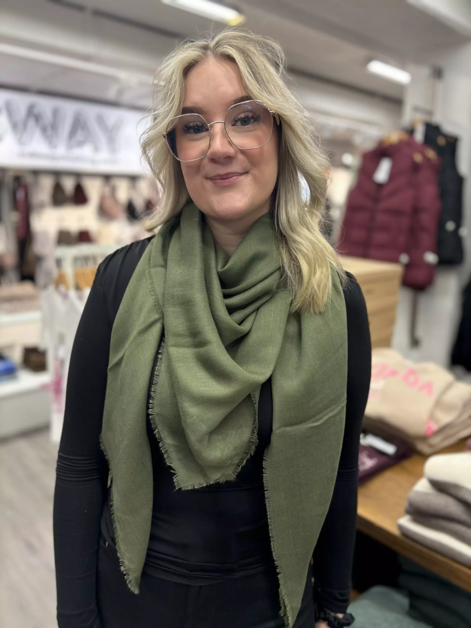 Neliön mallinen pehmoinen ja ohuehko huivi. Huivin koko on 130 cm x 130 cm
