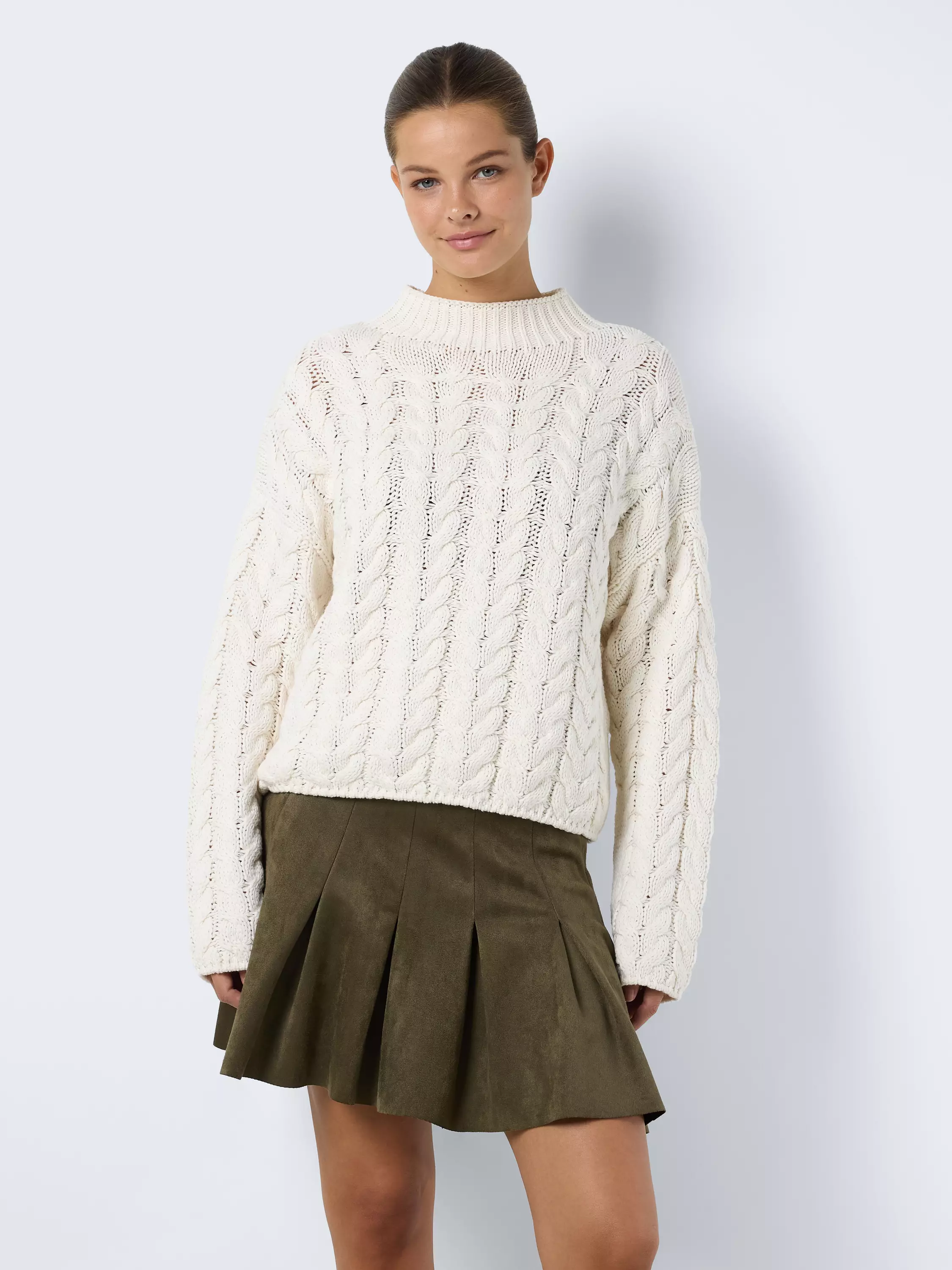 Palmikkoneule, jossa on korkea kaulus. Neule on hieman lyhyempää mallia.