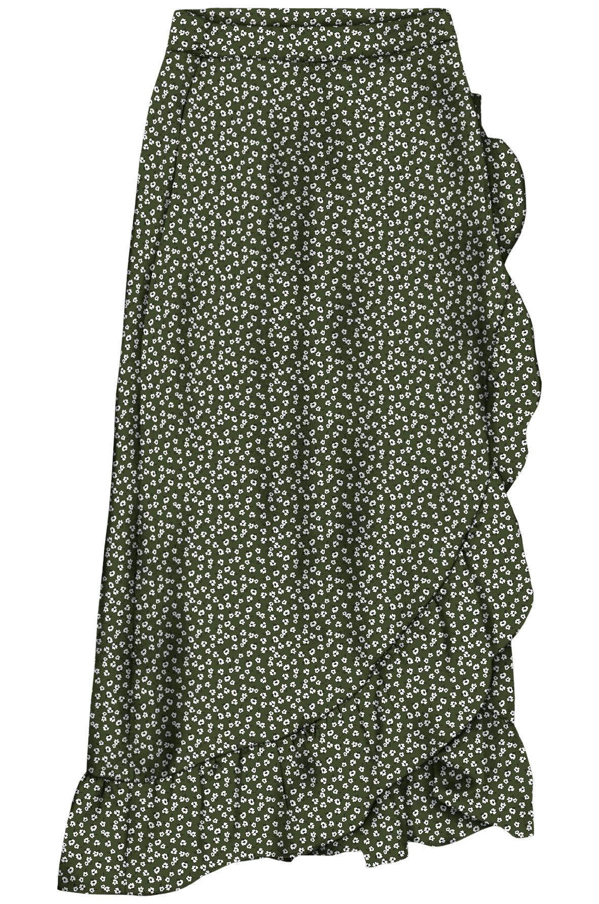 Sivulta solmittava kietaisuhame, jossa kaunis röyhelö helmassa.