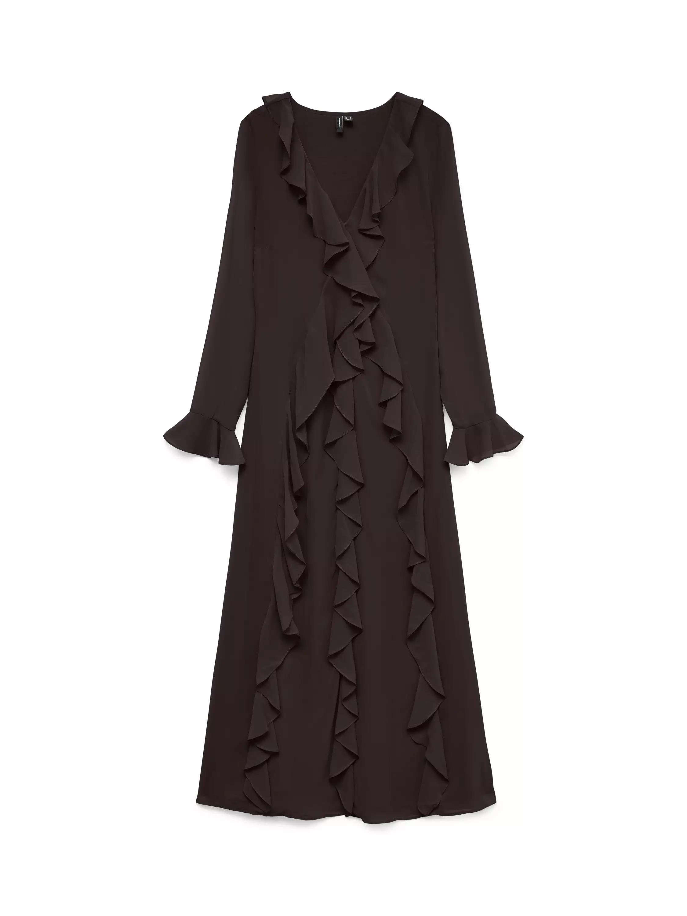 Nilkkamittainen vuorillinen mekko, jossa on edessä kauniita röyhelösomisteita. Mekon sivussa on vetoketju.