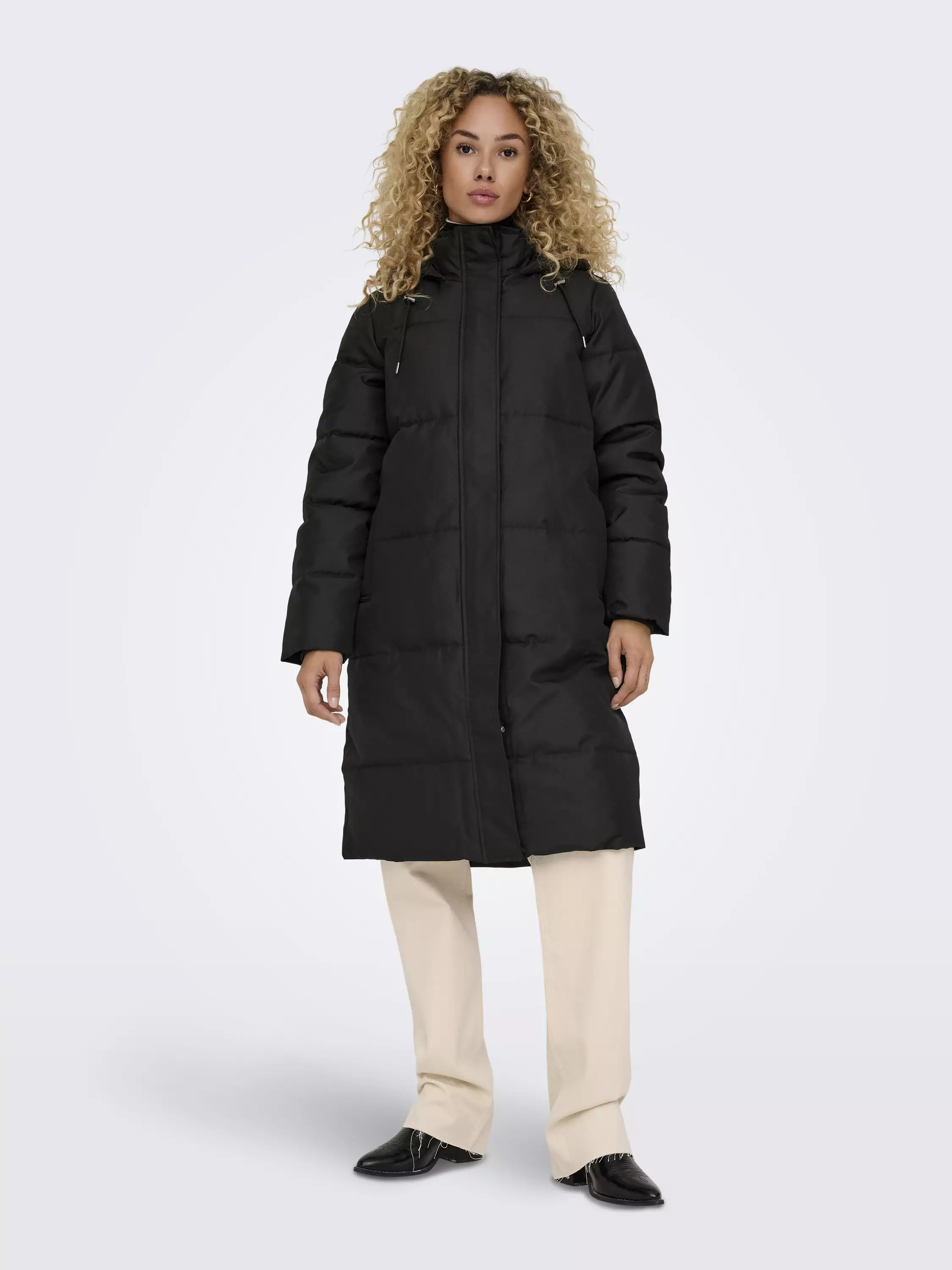 Pohjemittainen hupullinen takki, jossa on nappilista vetoketjun edessä. Takissa on kaksi nepparitaskua edessä ja hupussa on kiristysmahdollisuus.