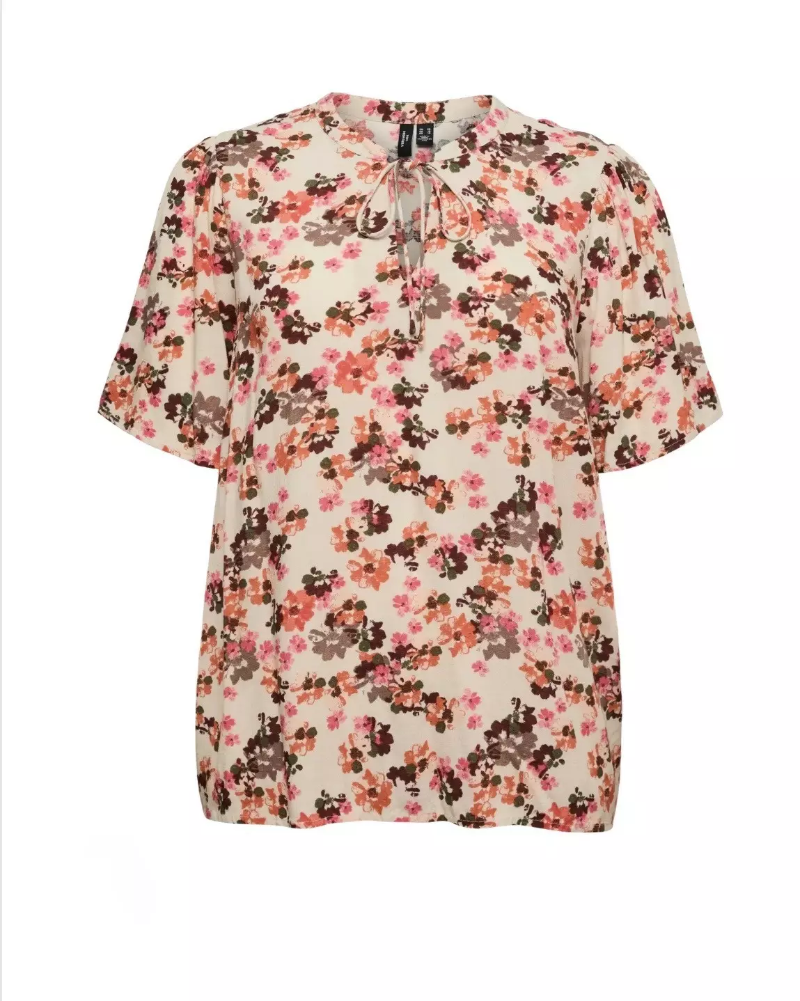 Lyhythihainen paita, jossa on v-pääntie ja solmittavat nauhat kauluksessa.