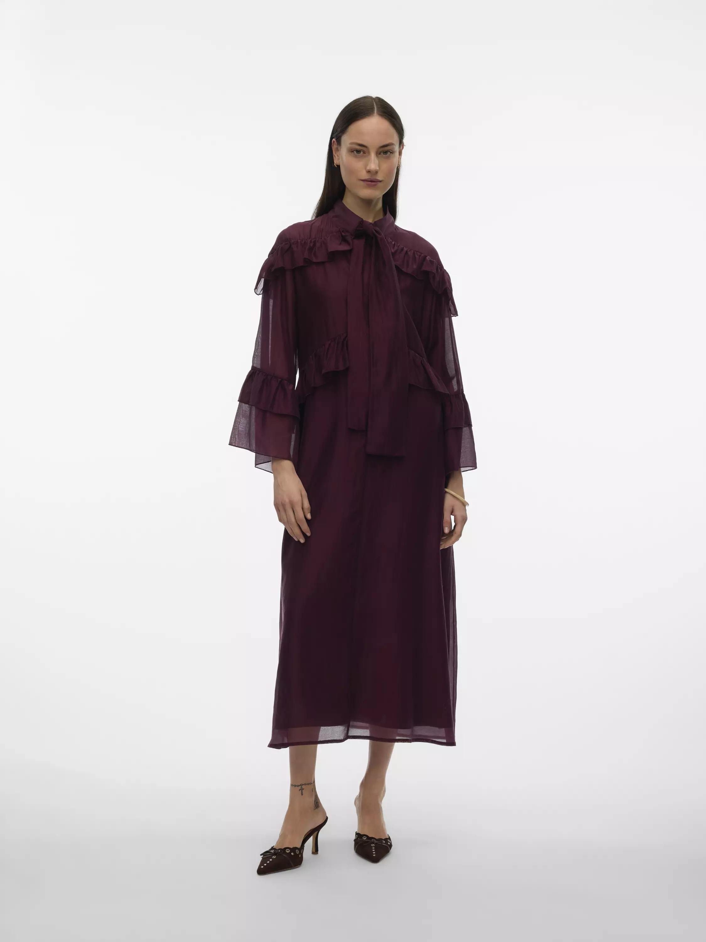 Vuorillinen maxi -mittainen mekko, jossa on kauniit hieman vajaamittaiset hihat. Hihoissa sekä hameen yläosassa on kauniit frillat. Edessä on solmittavat narut. Hox! Mekossa on reilu koko!