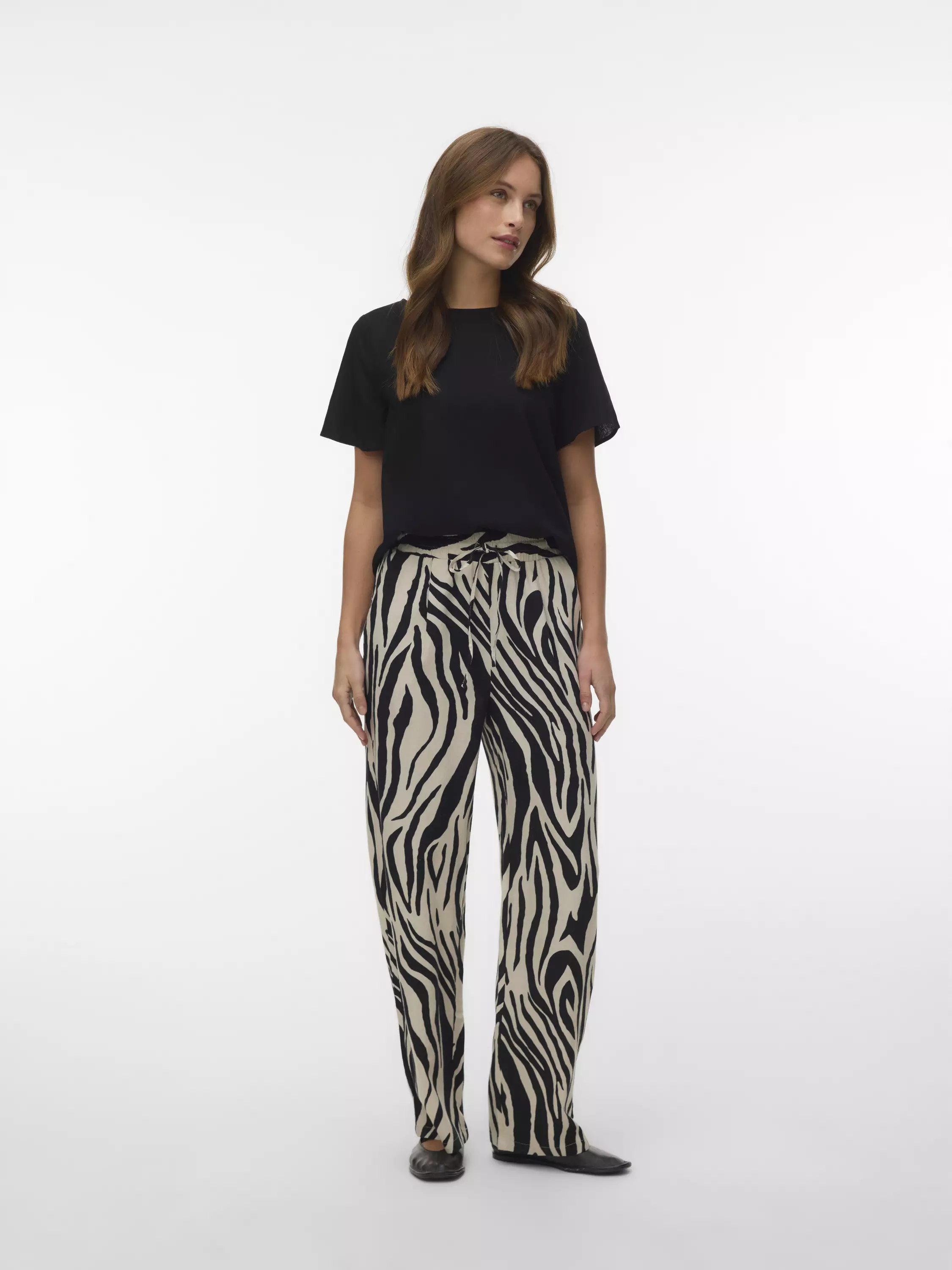 Korkeavyötäröiset leveät housut, joissa on joustava vyötärö ja kiristysnaru. Housuissa on sivutaskut.
