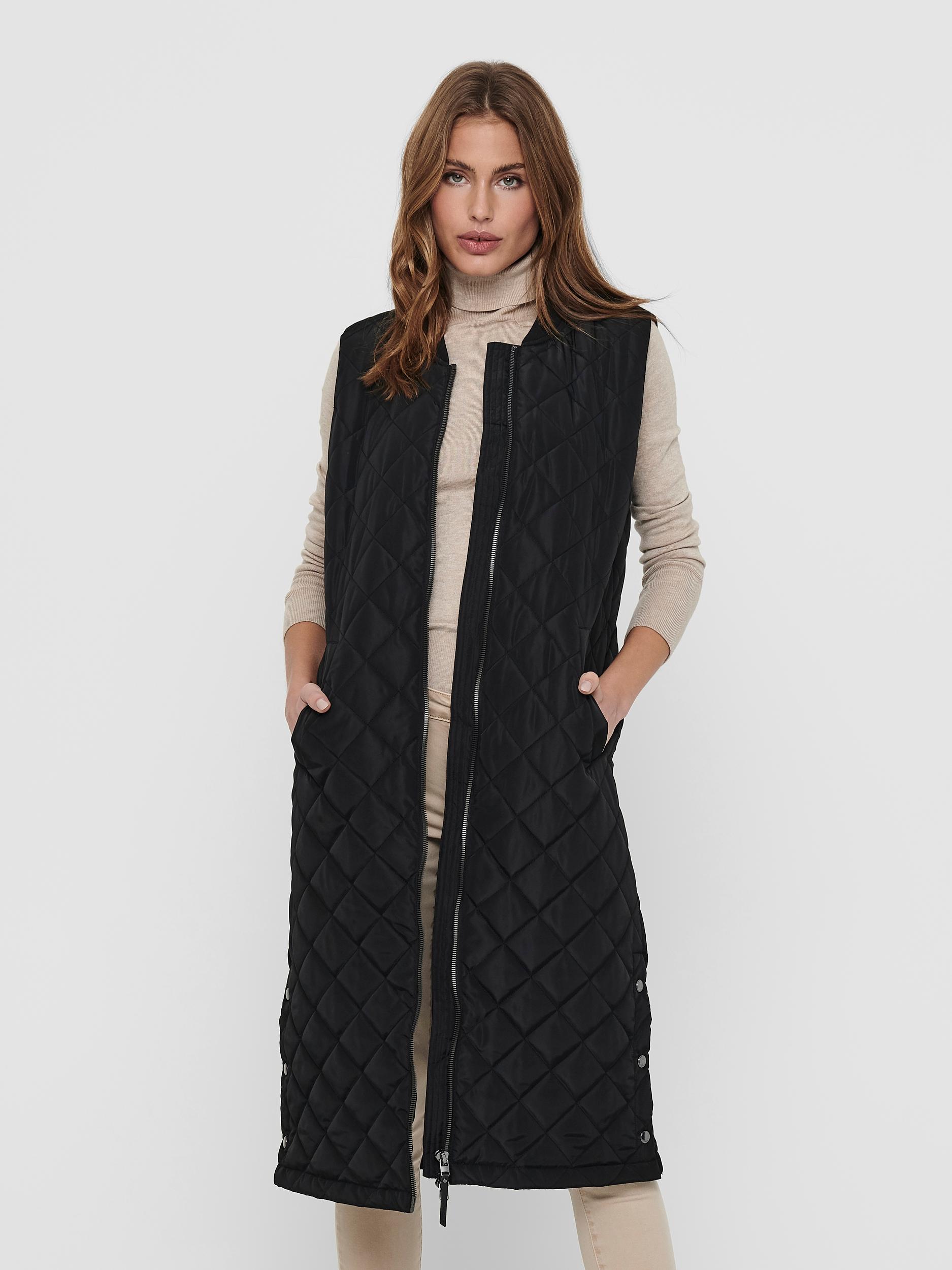 Pitkä tikattu liivi, jossa nepparitaskut ja helman sivuissa pienet nepparilliset halkiot. Vetoketju aukeaa myös alhaalta päin.