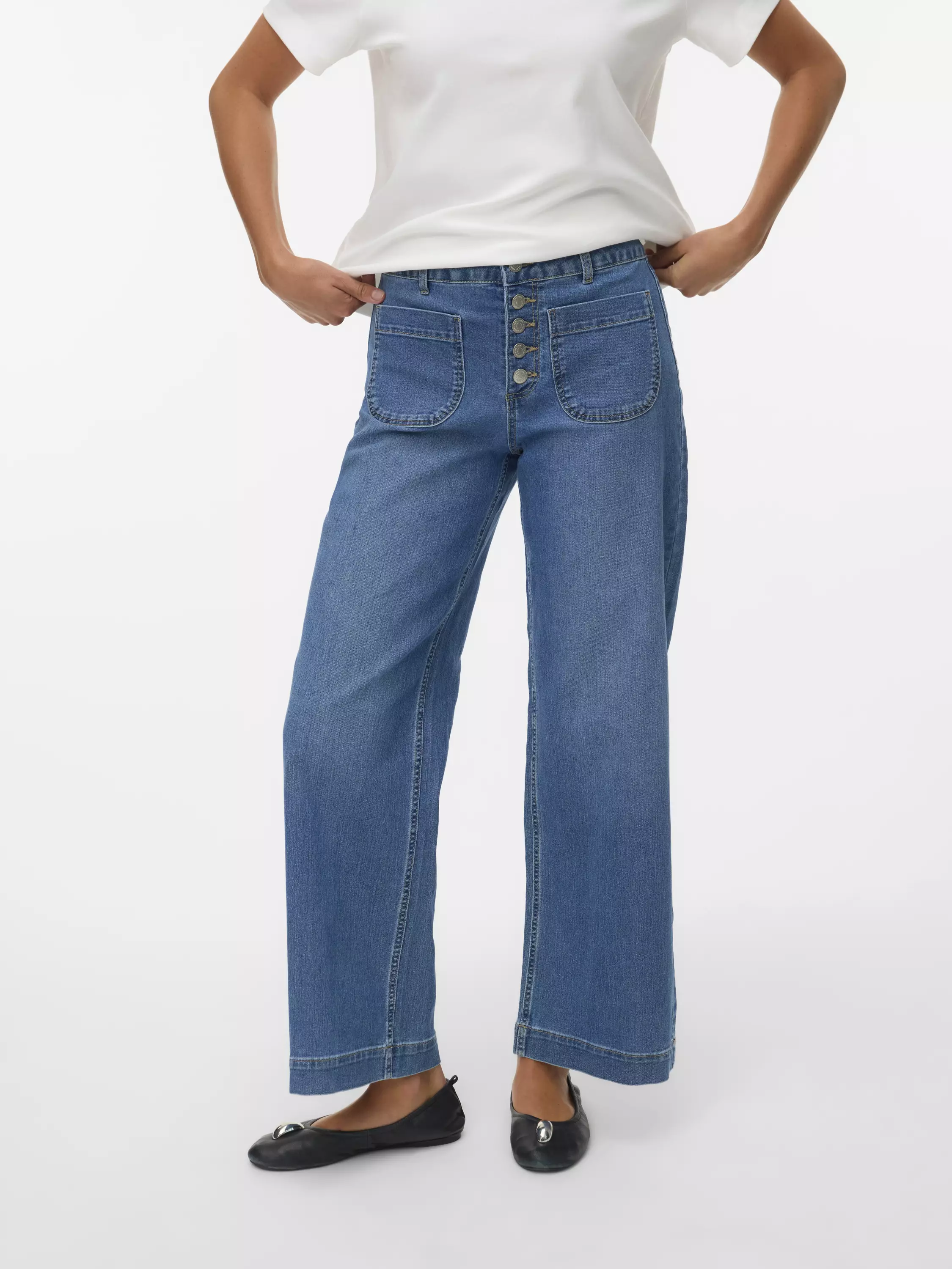 Leveälahkeiset farkut, joissa on korkea vyötärö ja kangas on mukavan joustavaa. Farkkujen edestä löytyy napit sekä kivat etutaskut.