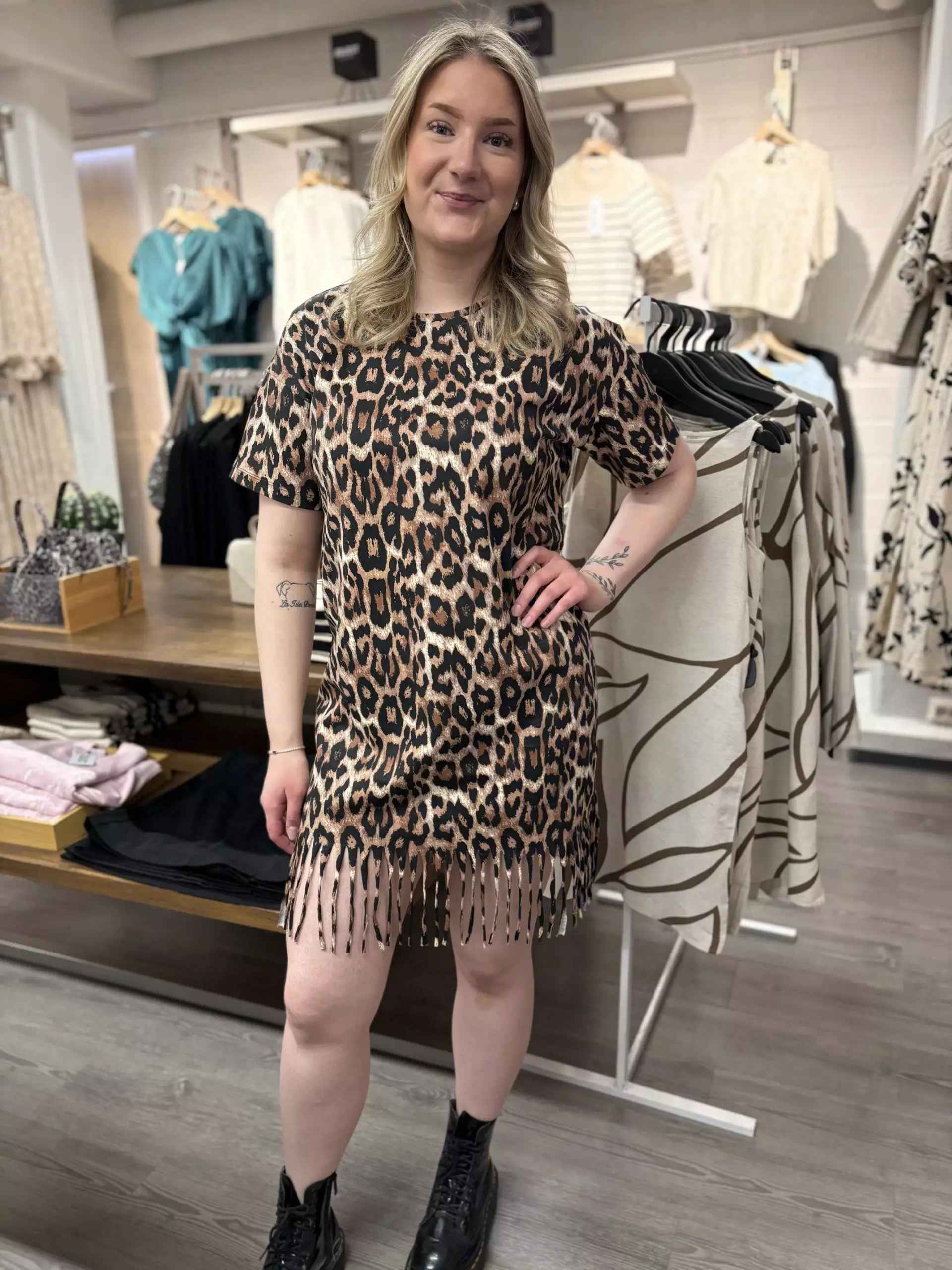 Oversize-mallinen t-paitamekko, jossa on helmassa hapsut.