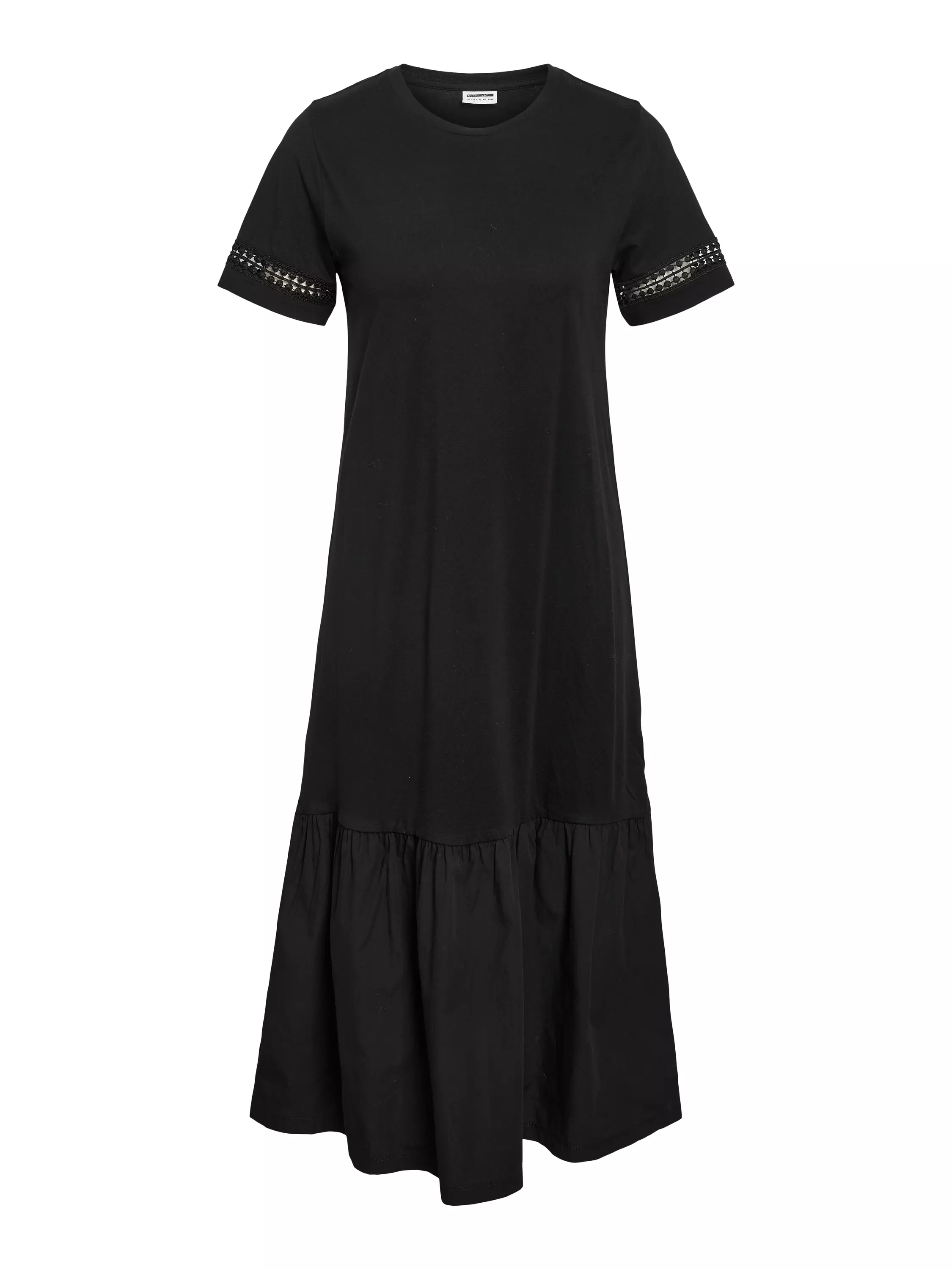 Pohjemittainen mekko, jossa on lyhyet pitsisomisteut hihat ja levenevä helma.