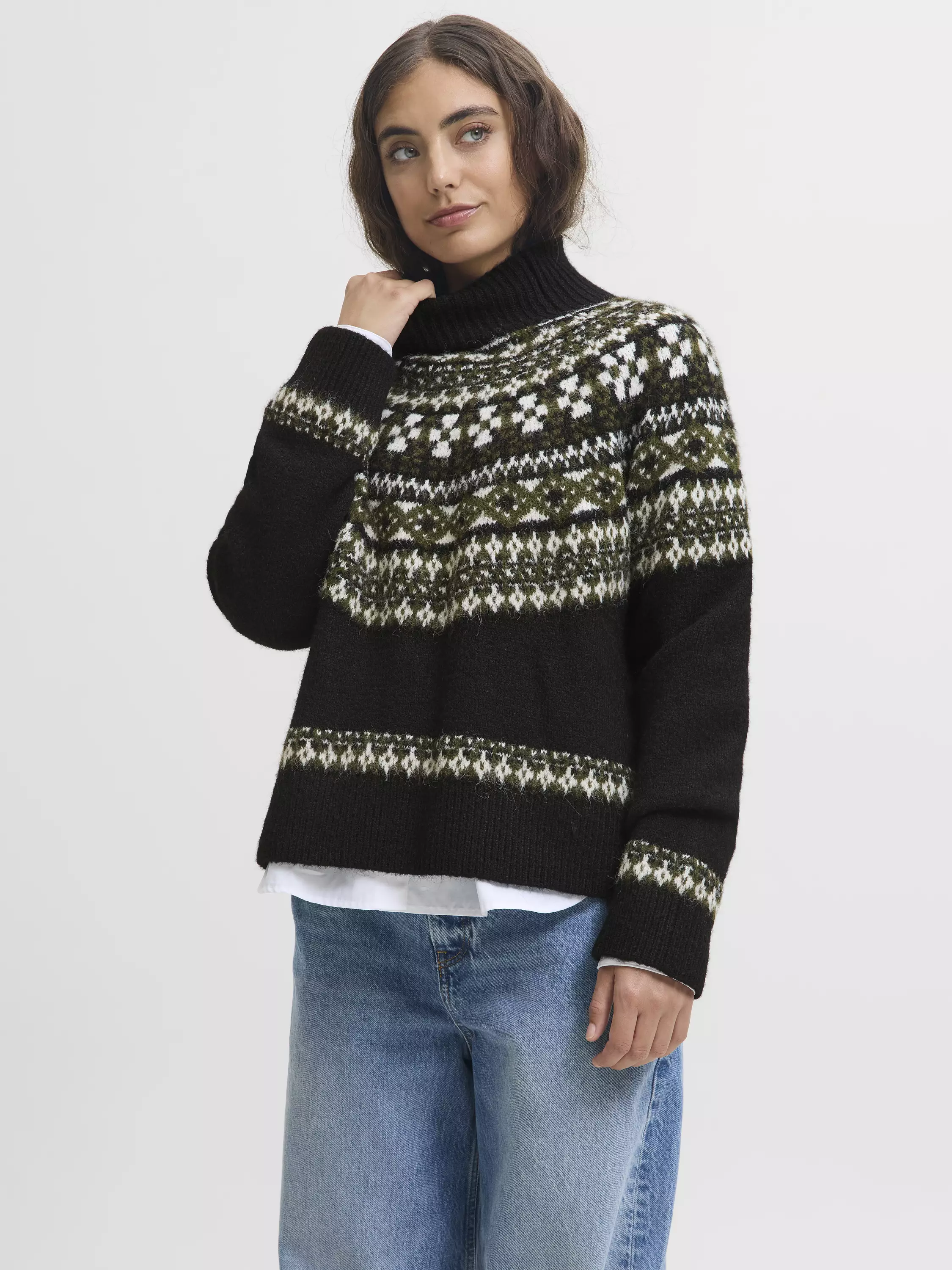 Kaunis kirjoneule, jossa on korkea kaulus.