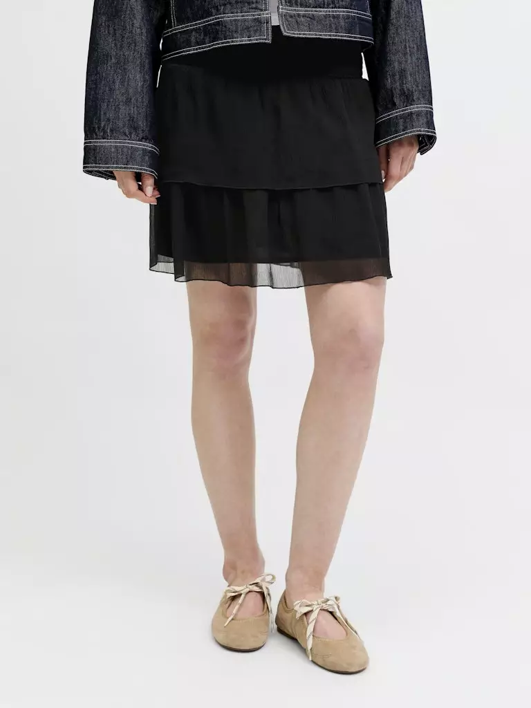 Lyhyt sifonkihame, jossa on smokkirypyty yläosassa. Hameessa on vuori.