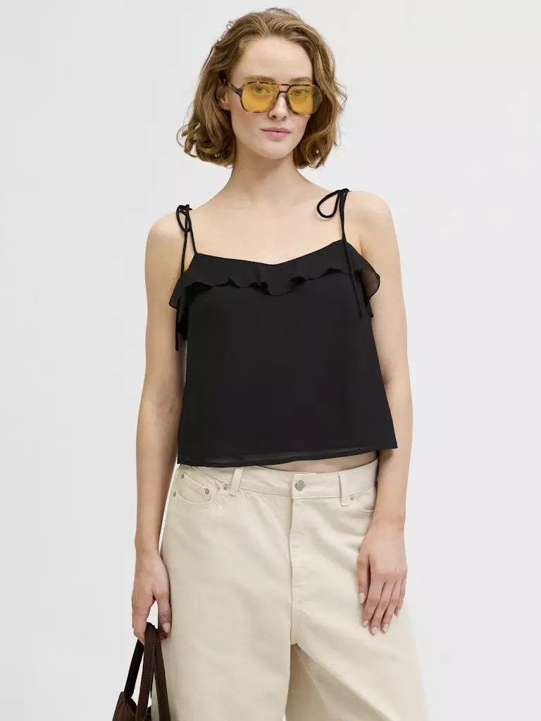 Ohutolkaiminen sifonkitoppi, jossa on vuori. Topin yläosassa on kaunis röyhelö.