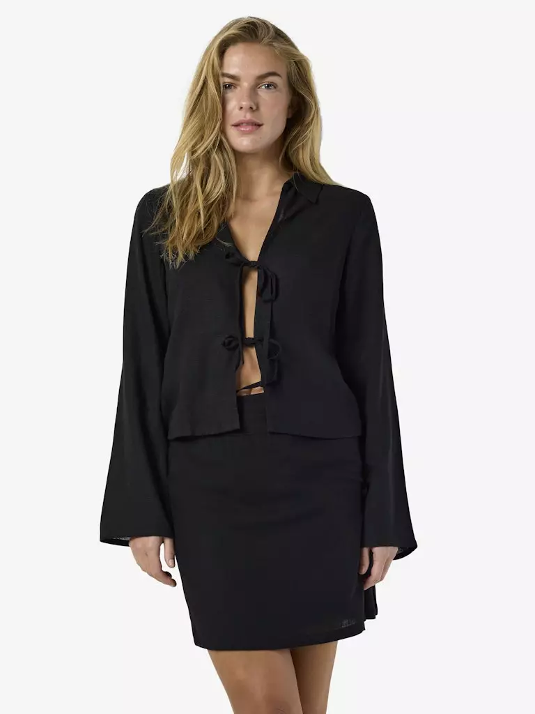 Pitkähihainen paita, joka somitaan edestä. Paidassa on kaulukset ja v-pääntie sekä levenevät hihat.