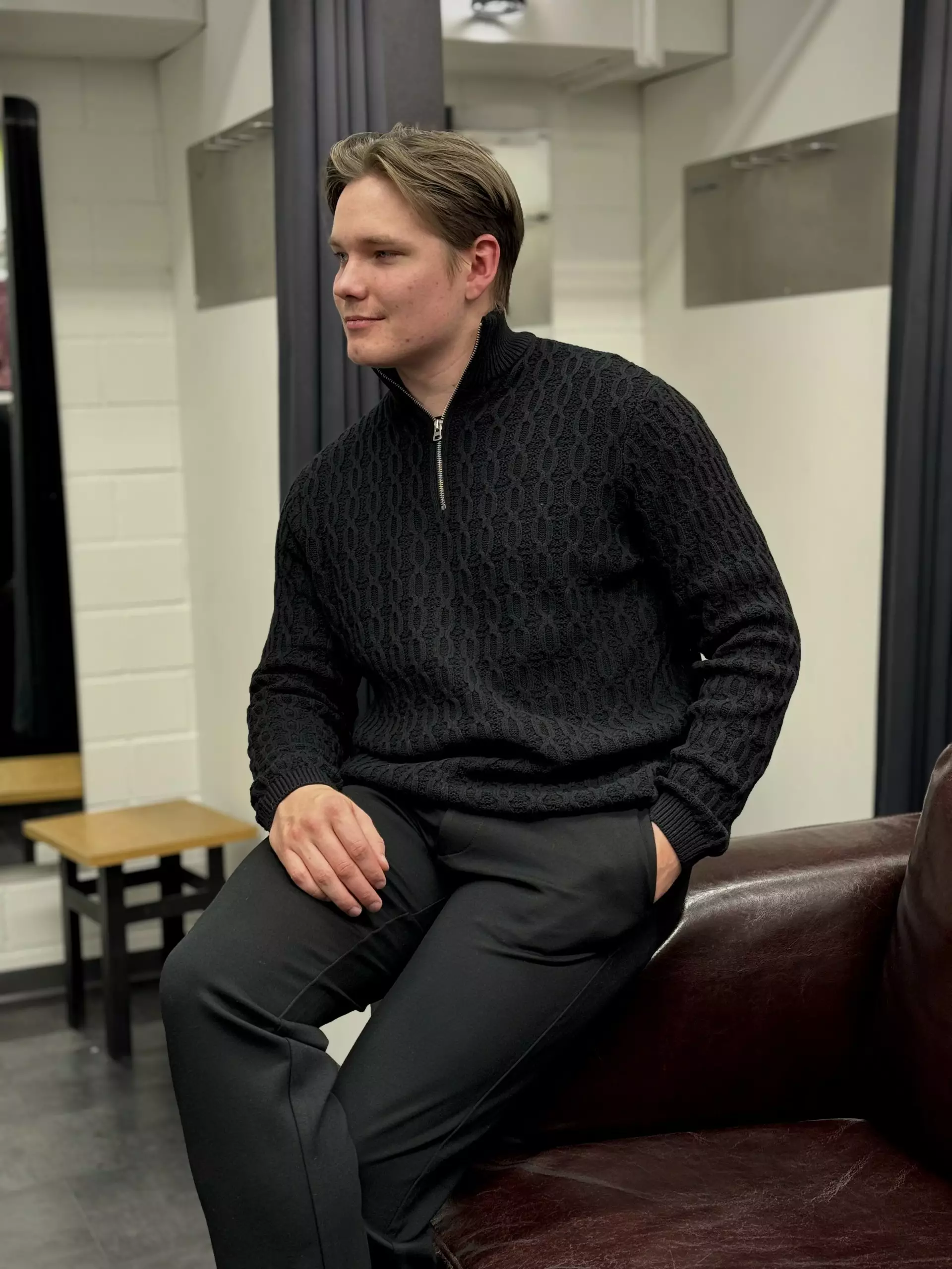 Korkeakauluksinen neule, jossa on vetoketju kauluksessa.